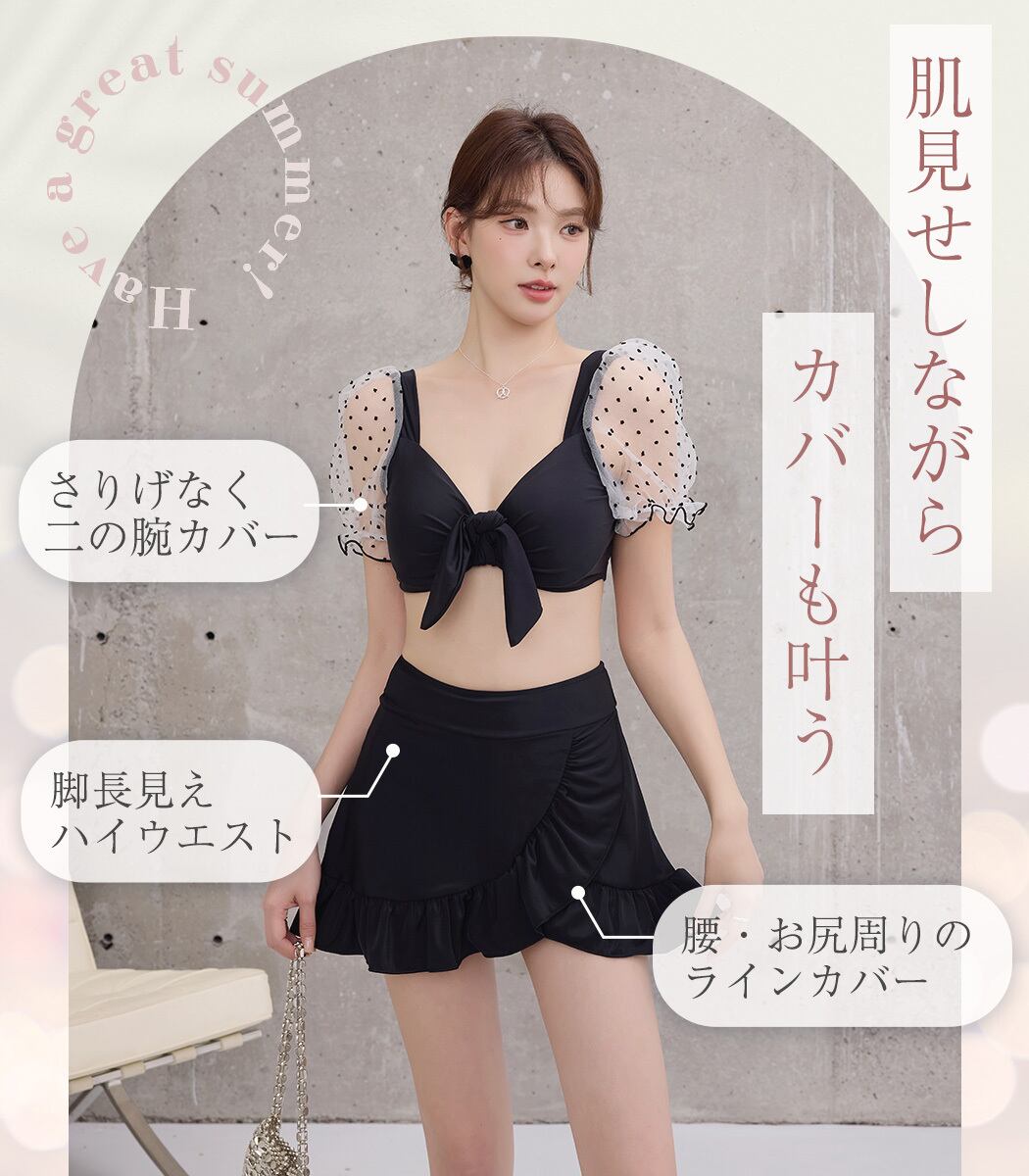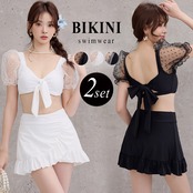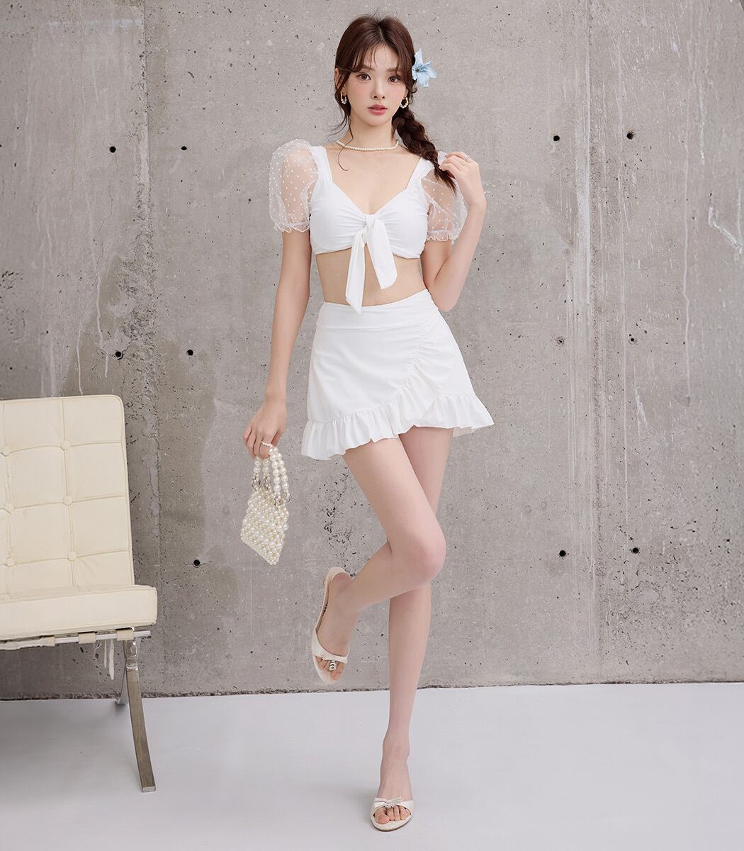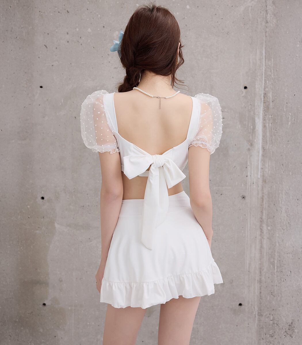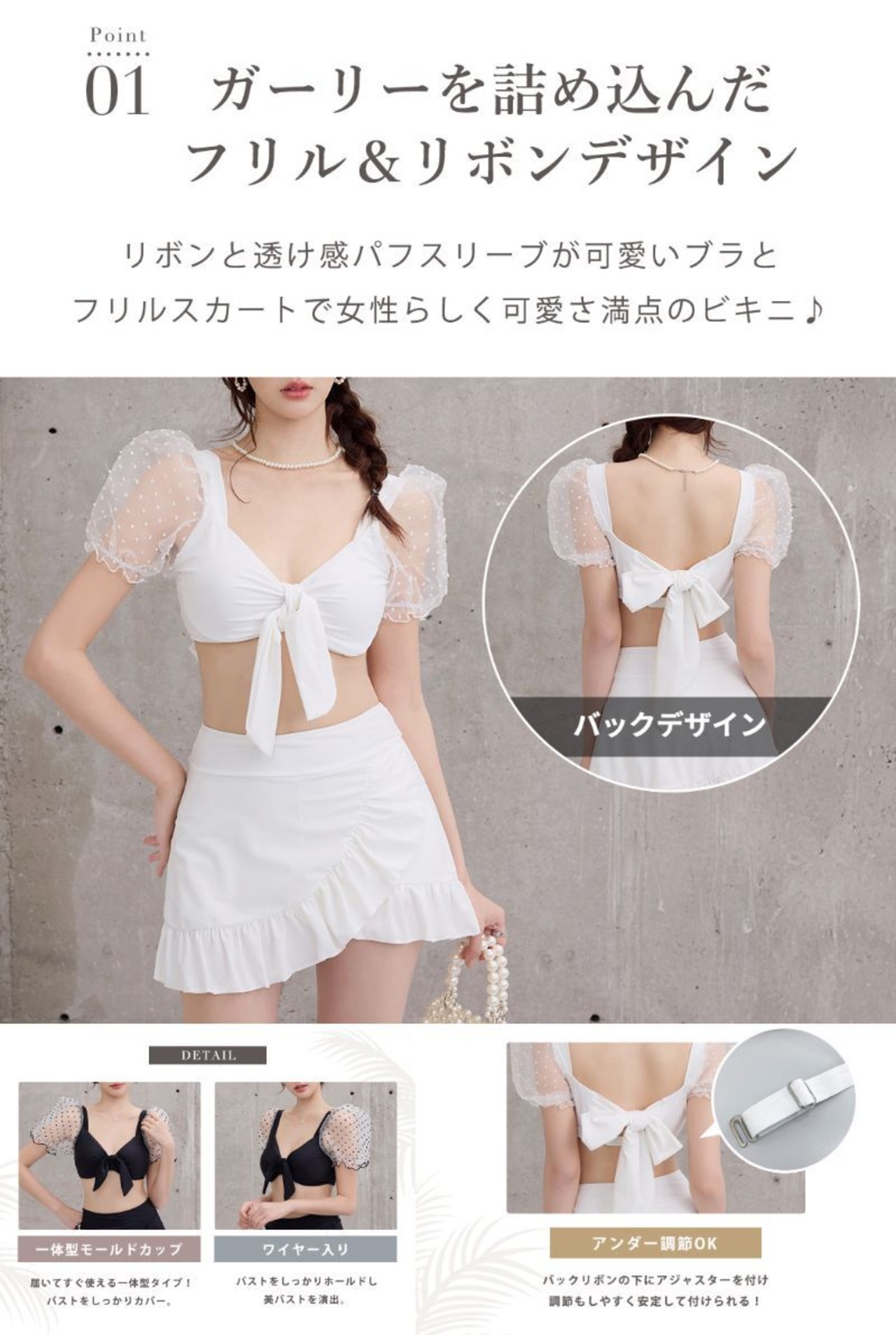 リボンと透け感パフスリーブが可愛いブラとフリルスカートで女性らしく可愛さ満点のビキニ♪