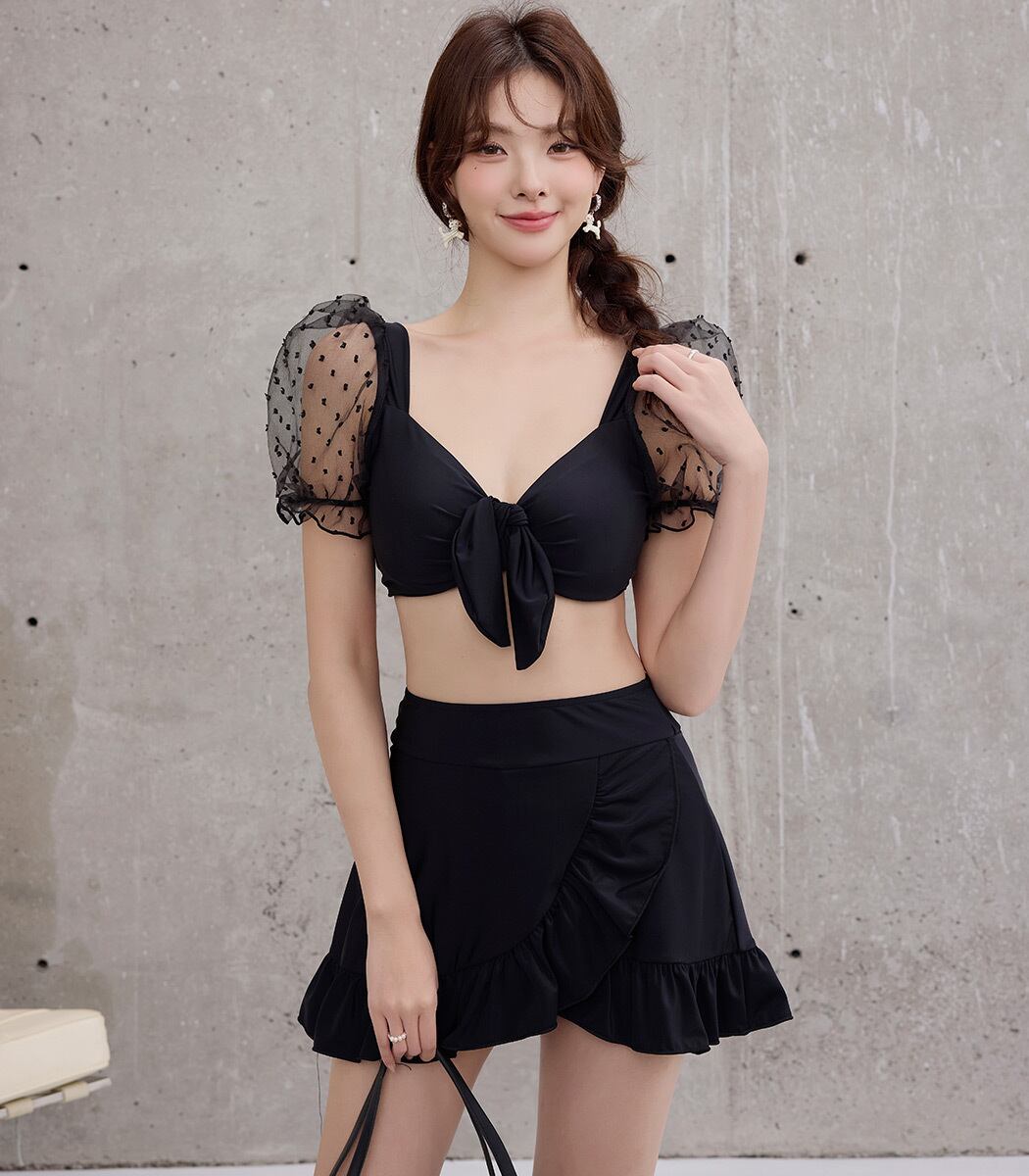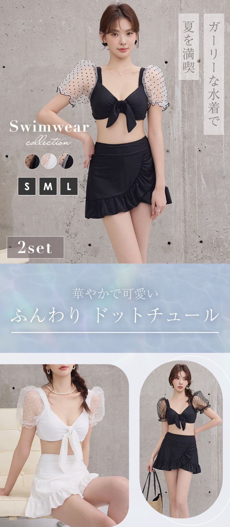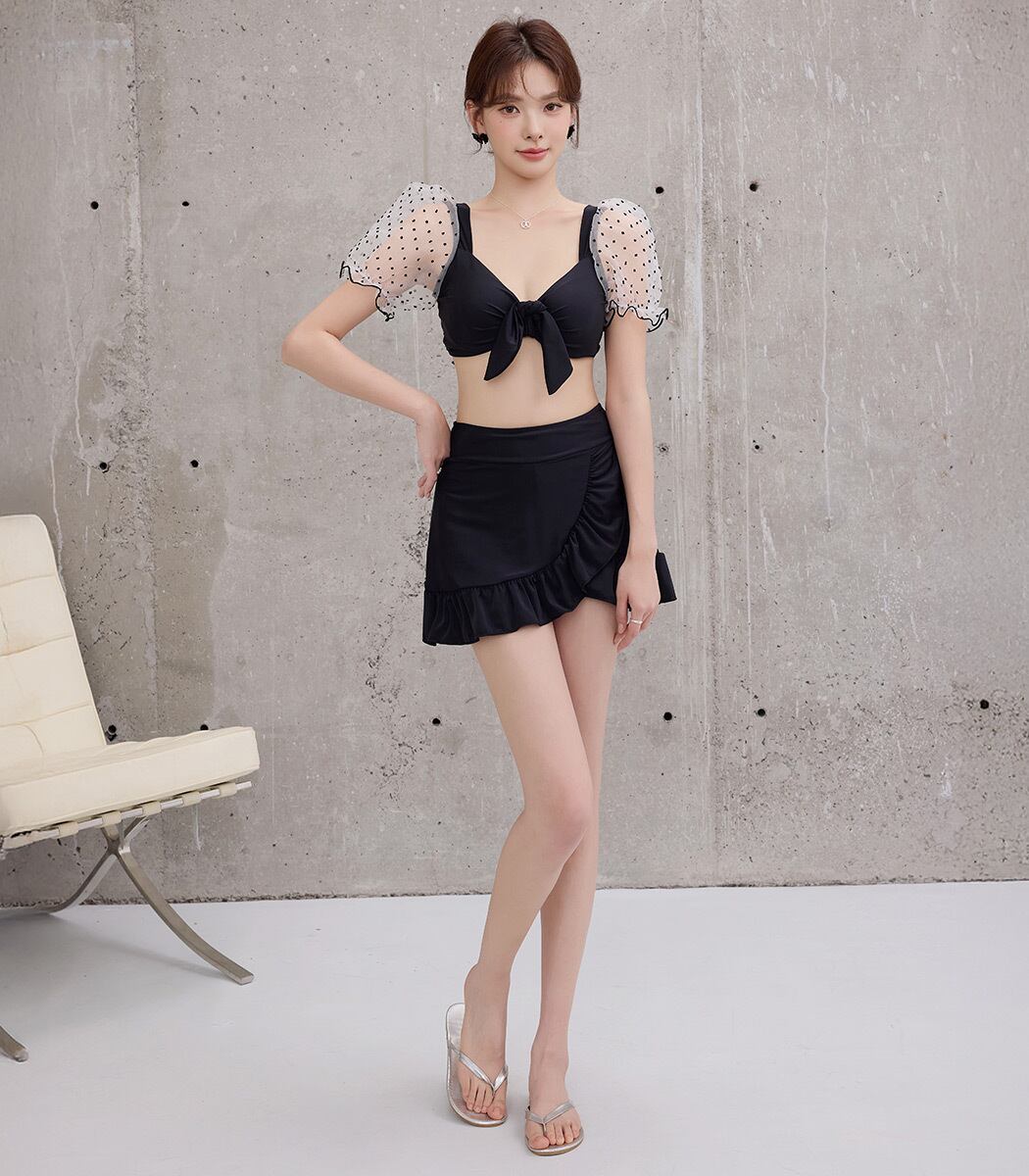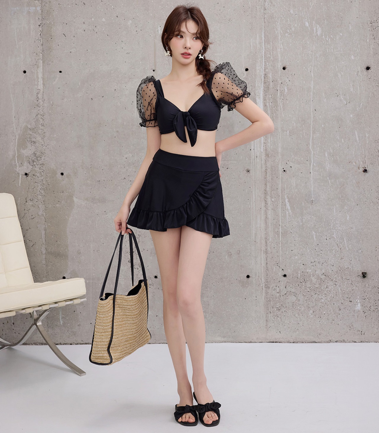 リボンと透け感パフスリーブが可愛いブラとフリルスカートで女性らしく可愛さ満点のビキニ♪