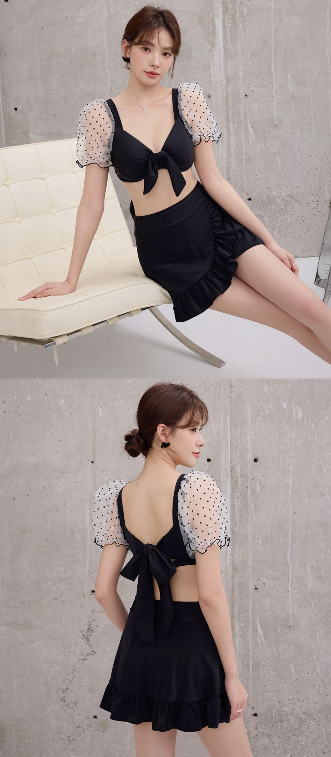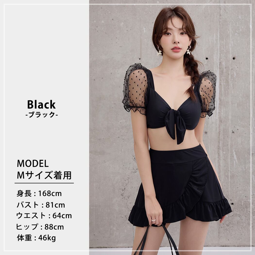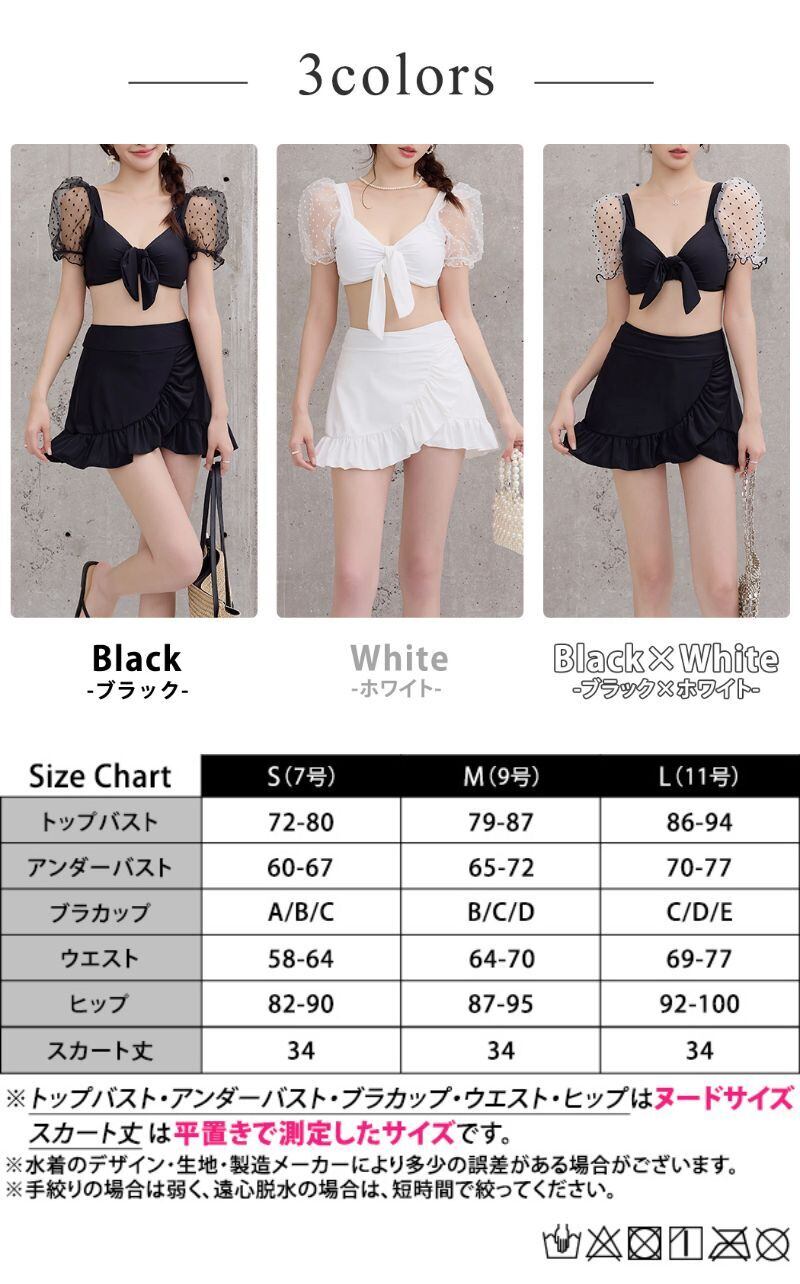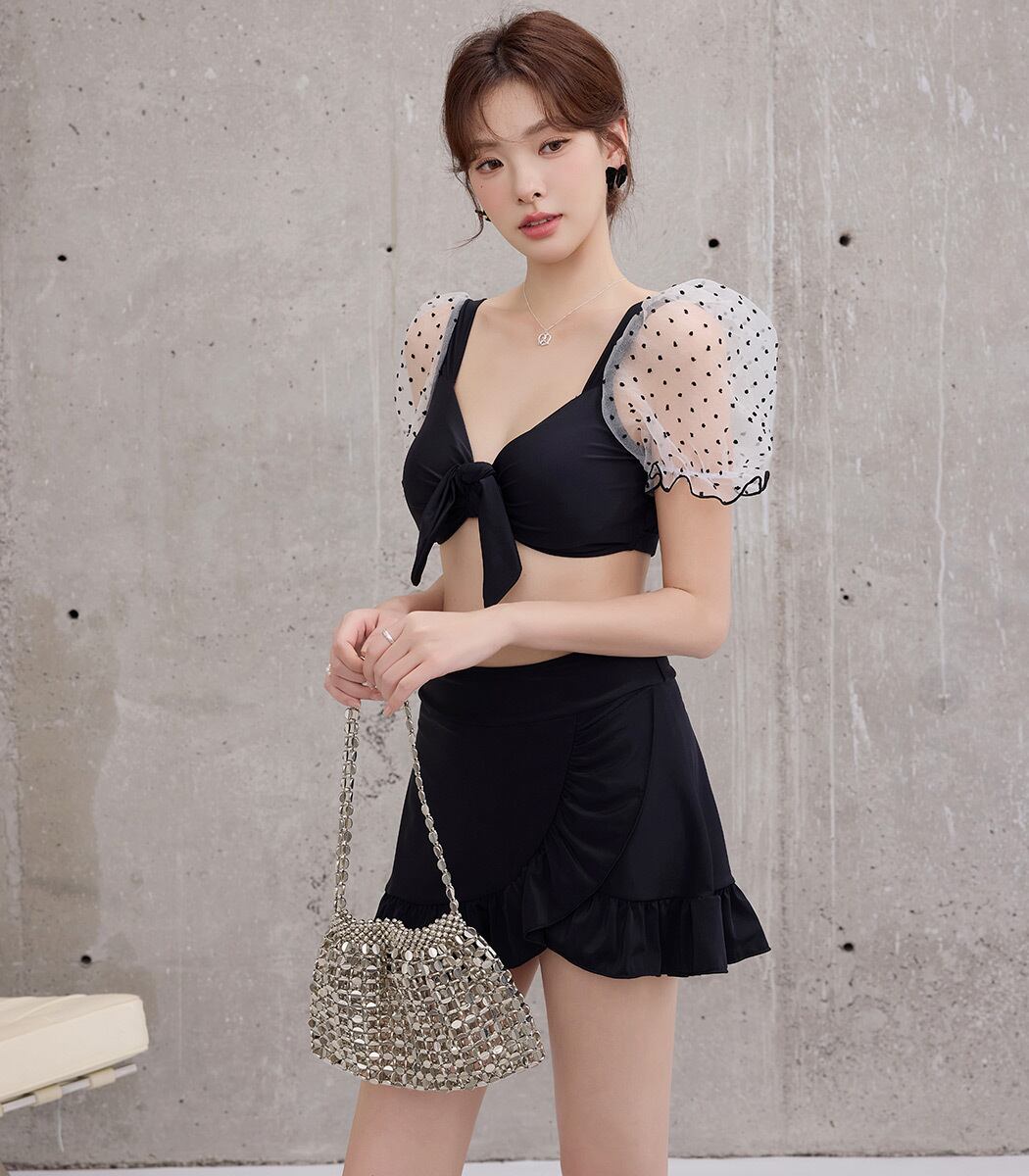 リボンと透け感パフスリーブが可愛いブラとフリルスカートで女性らしく可愛さ満点のビキニ♪