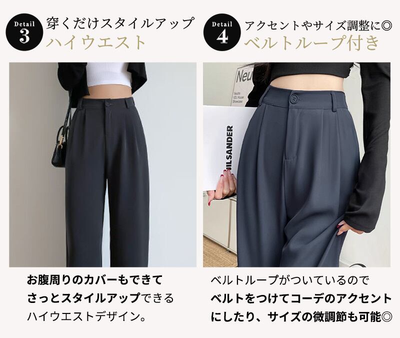 お腹周りのカバーもできてさっとスタイルアップできるハイウエストデザイン。