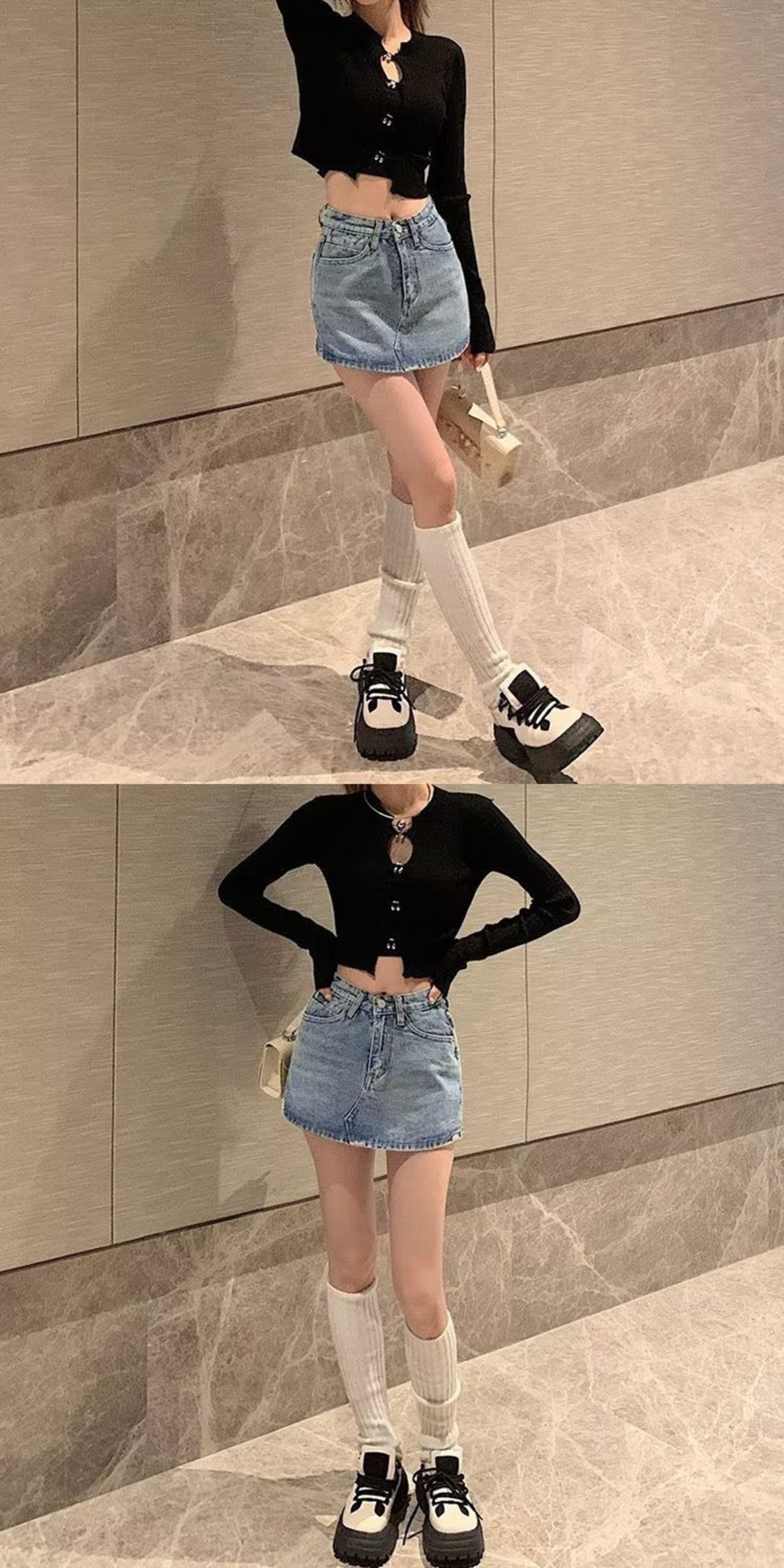ミニ丈で脚見せ美スタイルにデニムスカパン