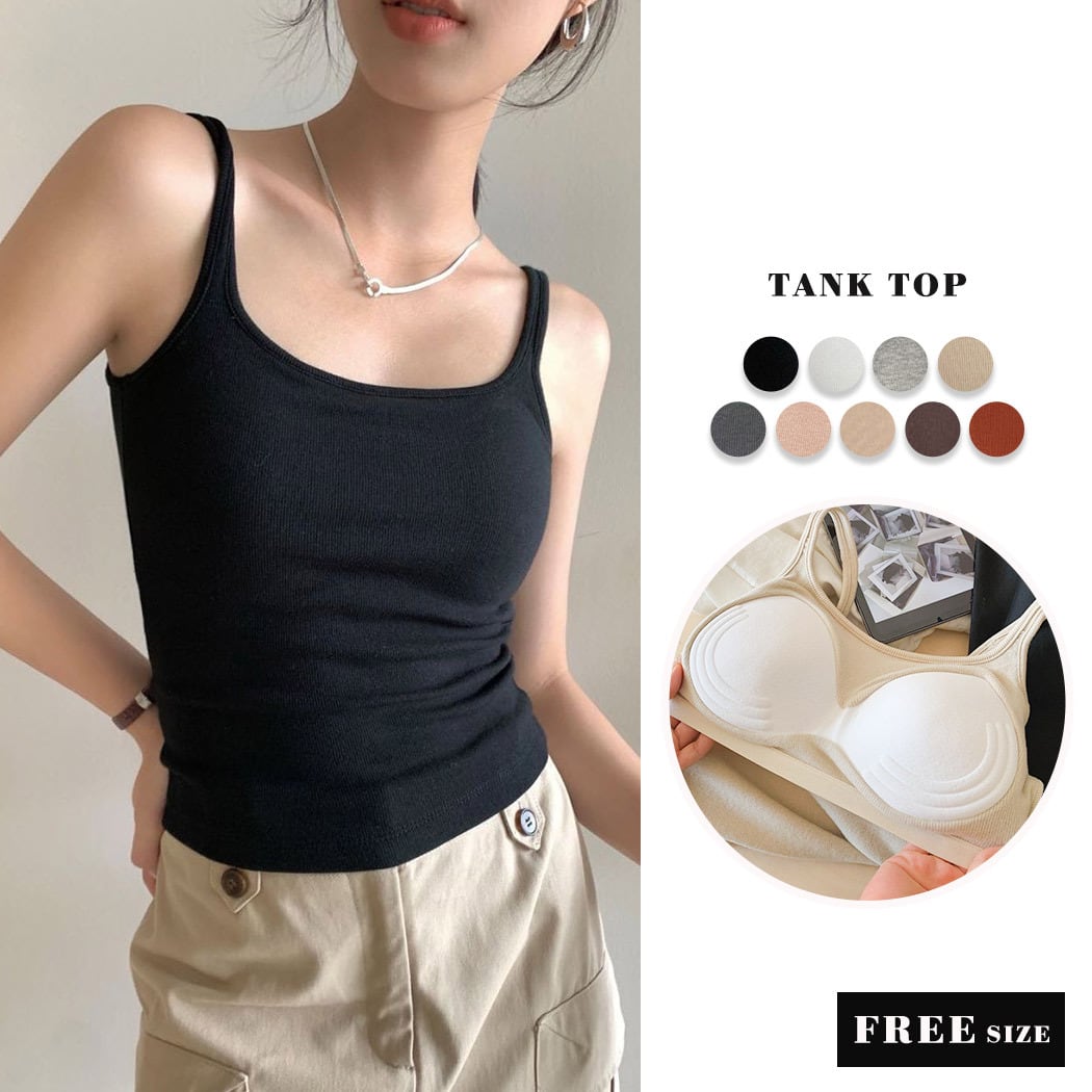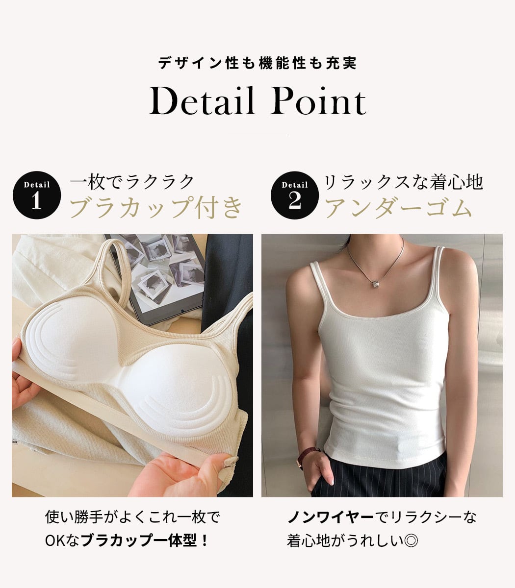 ブラカップ一体型がうれしいベーシックなデザインのタンクトップ。