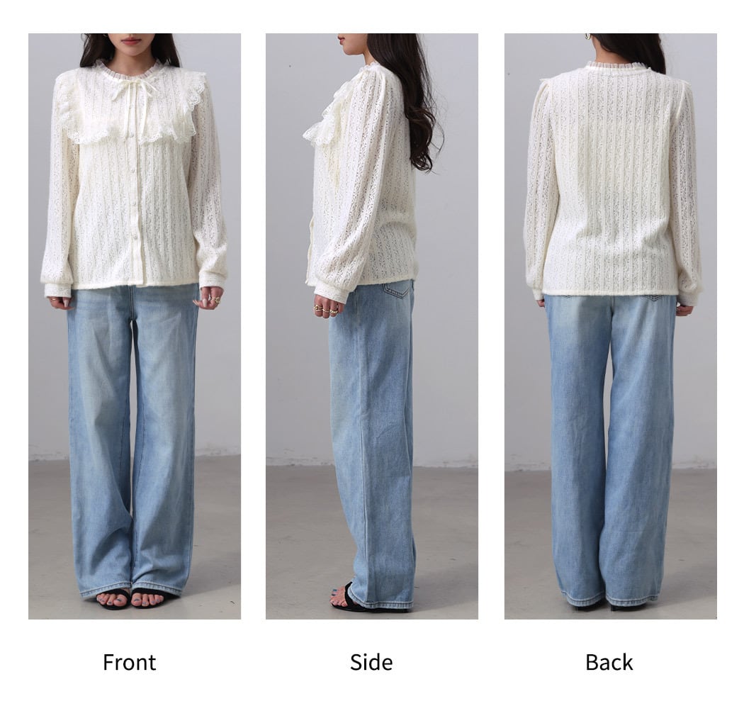 顔周りを優しい印象に見せてくれるオーガンジー生地のネックライン。