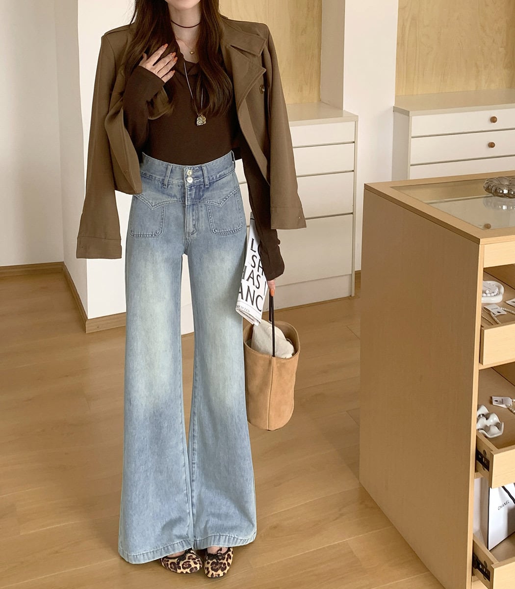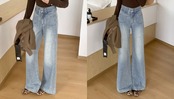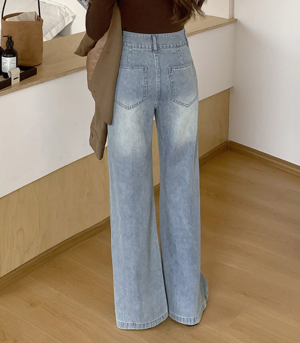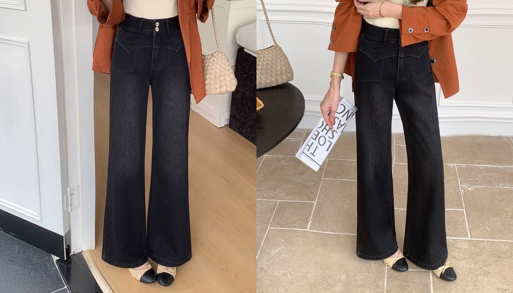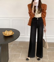 ダブルボタンのハイウエストで脚長効果&太すぎないワイドシルエットで足のラインを拾いにくいのも◎