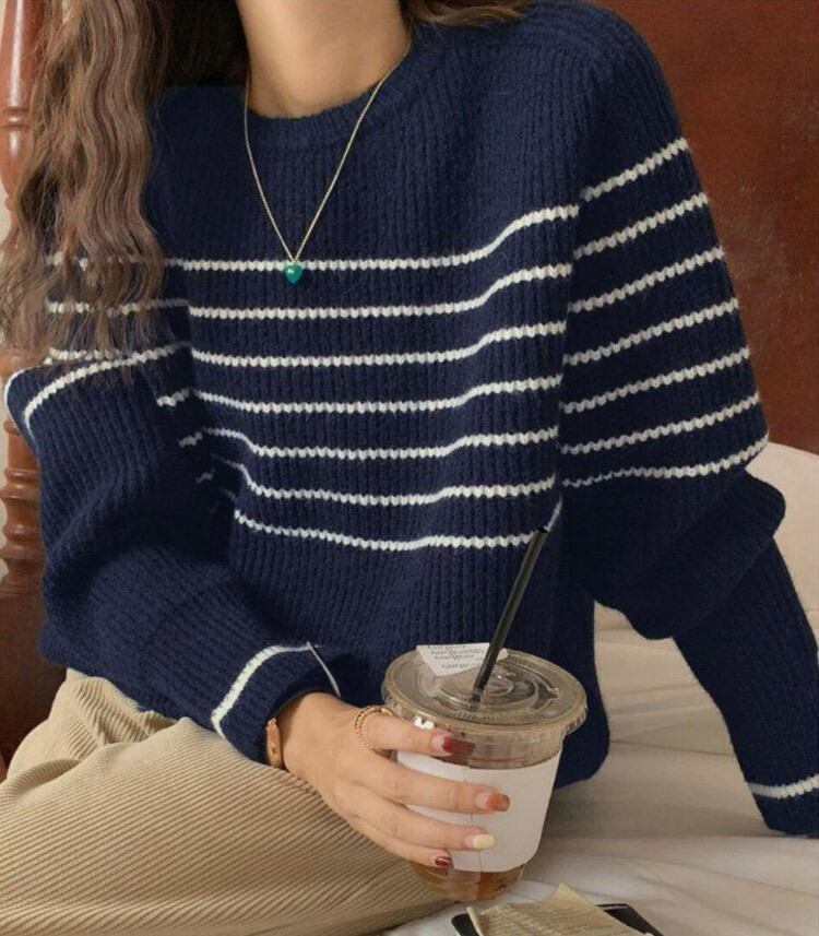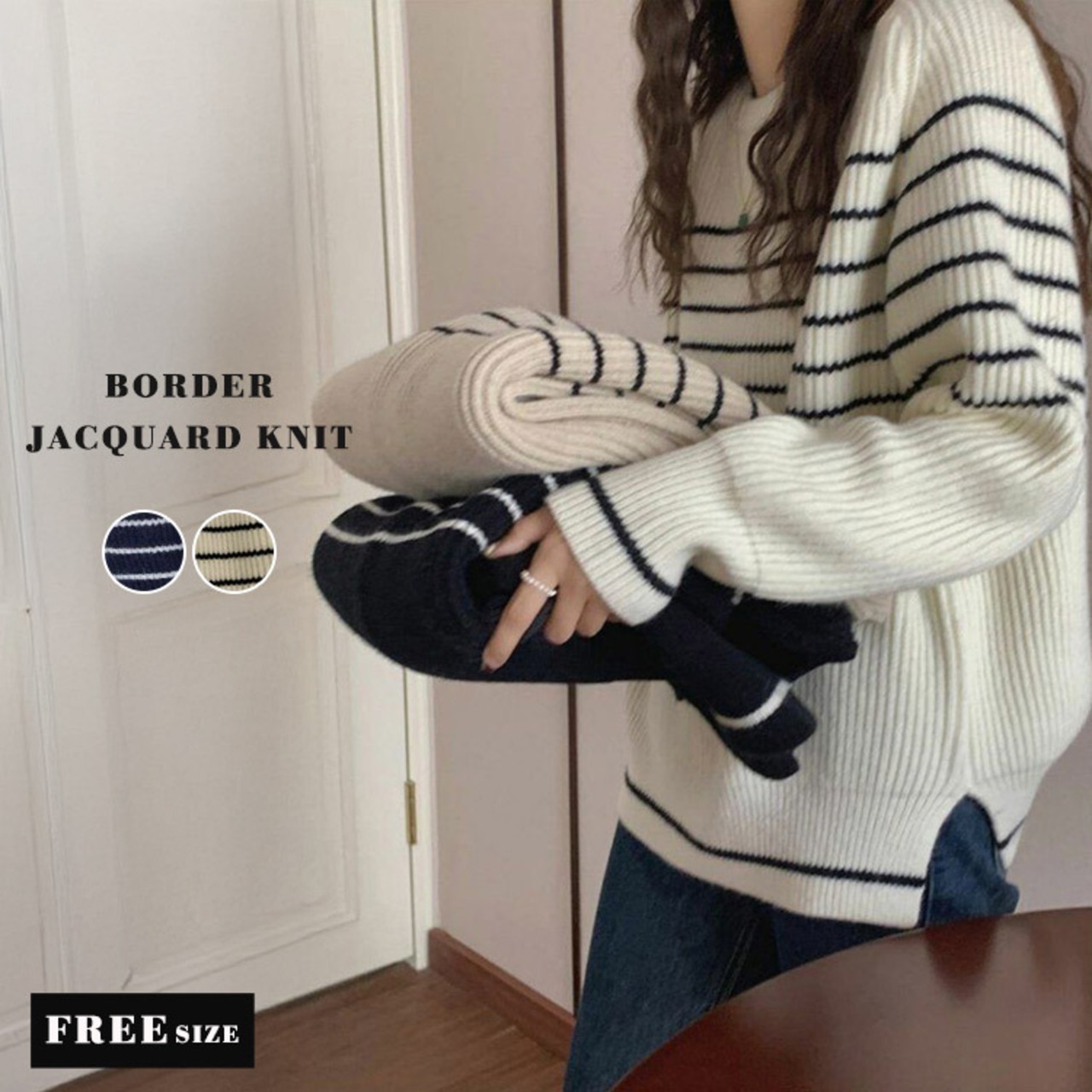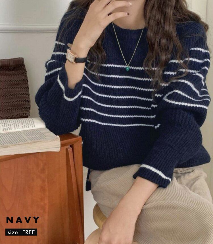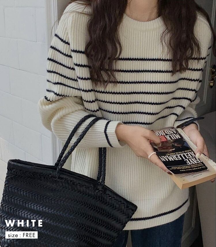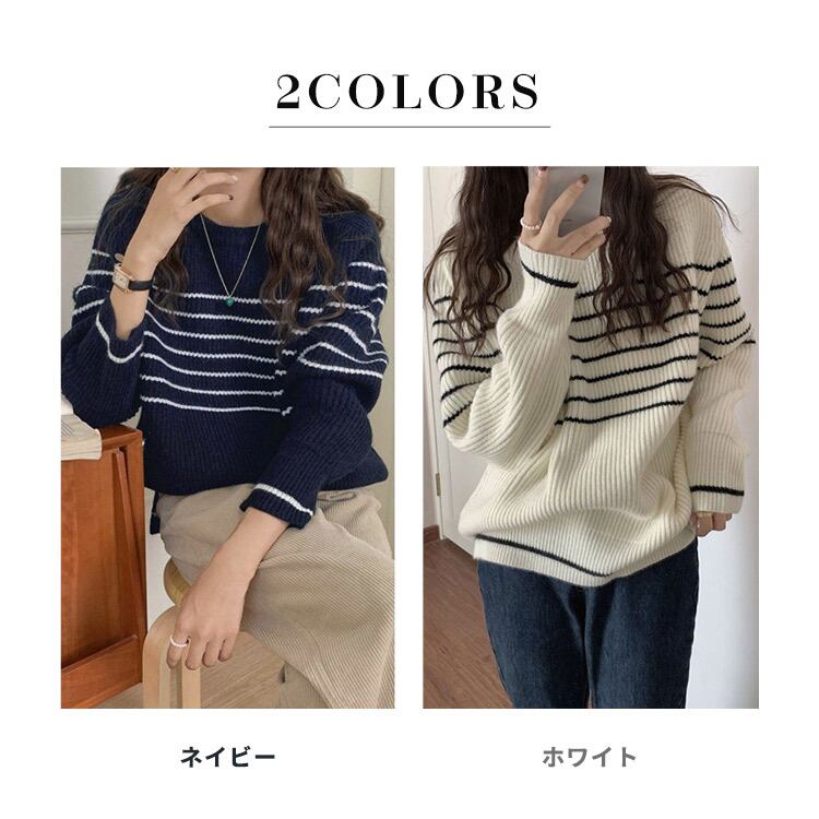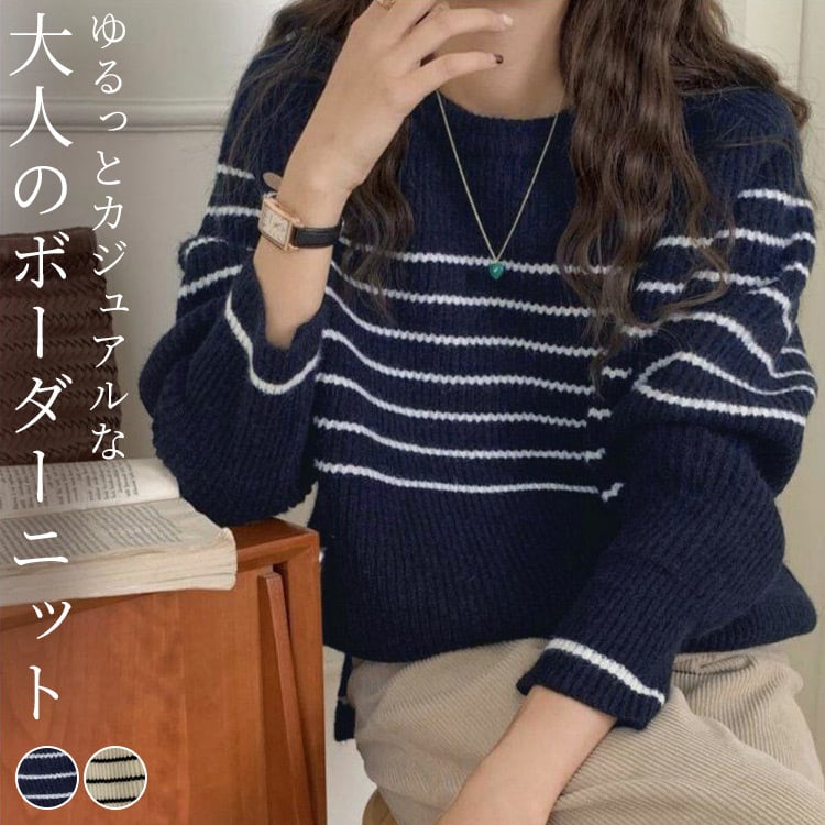 【宅配便】ゆるっとラフニット」ニット レディース 長袖 トップス リブ ボーダー ジャガードニット /tops2281