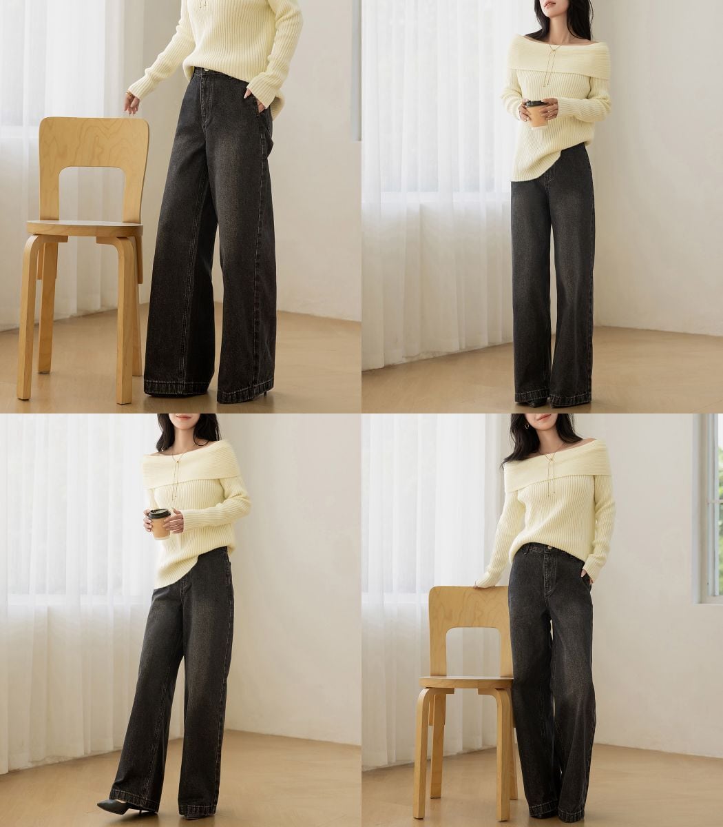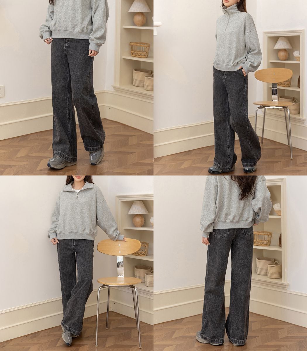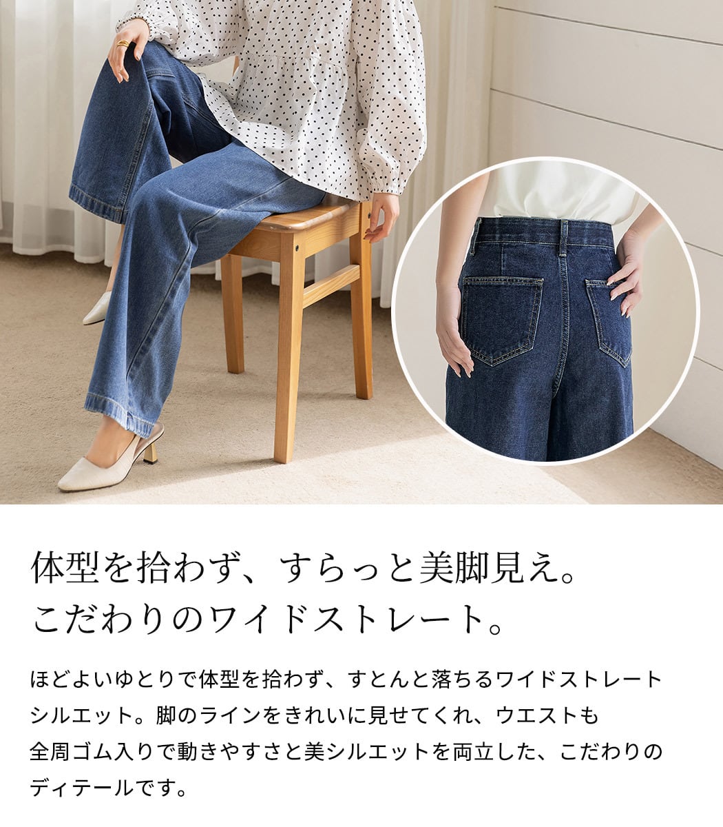 ほどよいゆとりで体型を拾わず、すとんと落ちるワイドストレートシルエット。