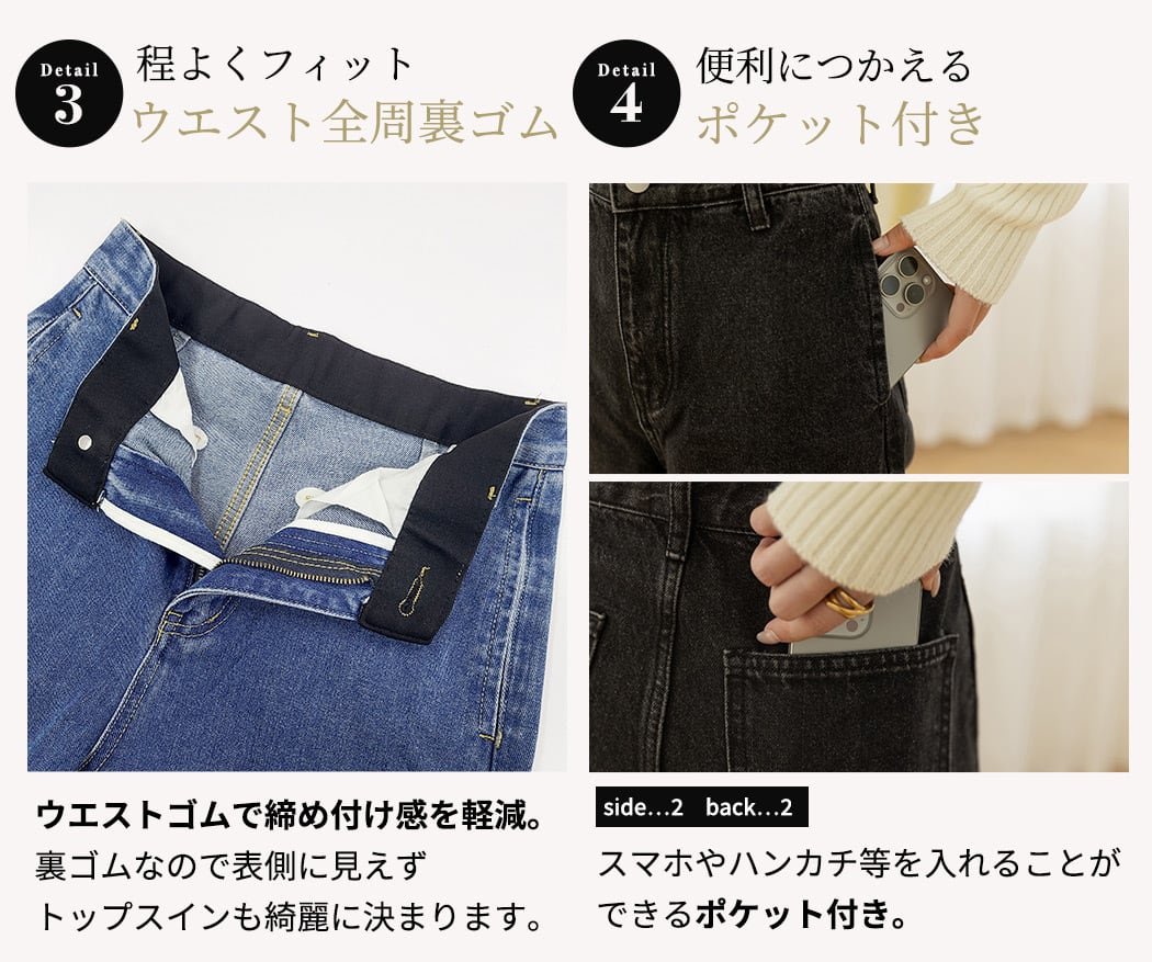 裏ゴムなので表側に見えずトップスインも綺麗に決まります。