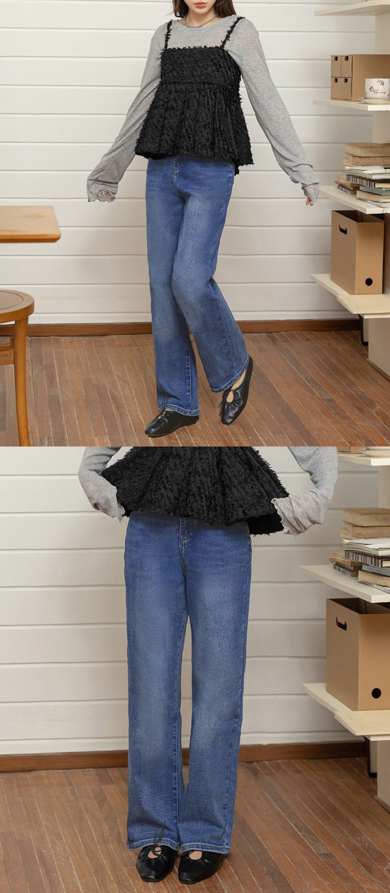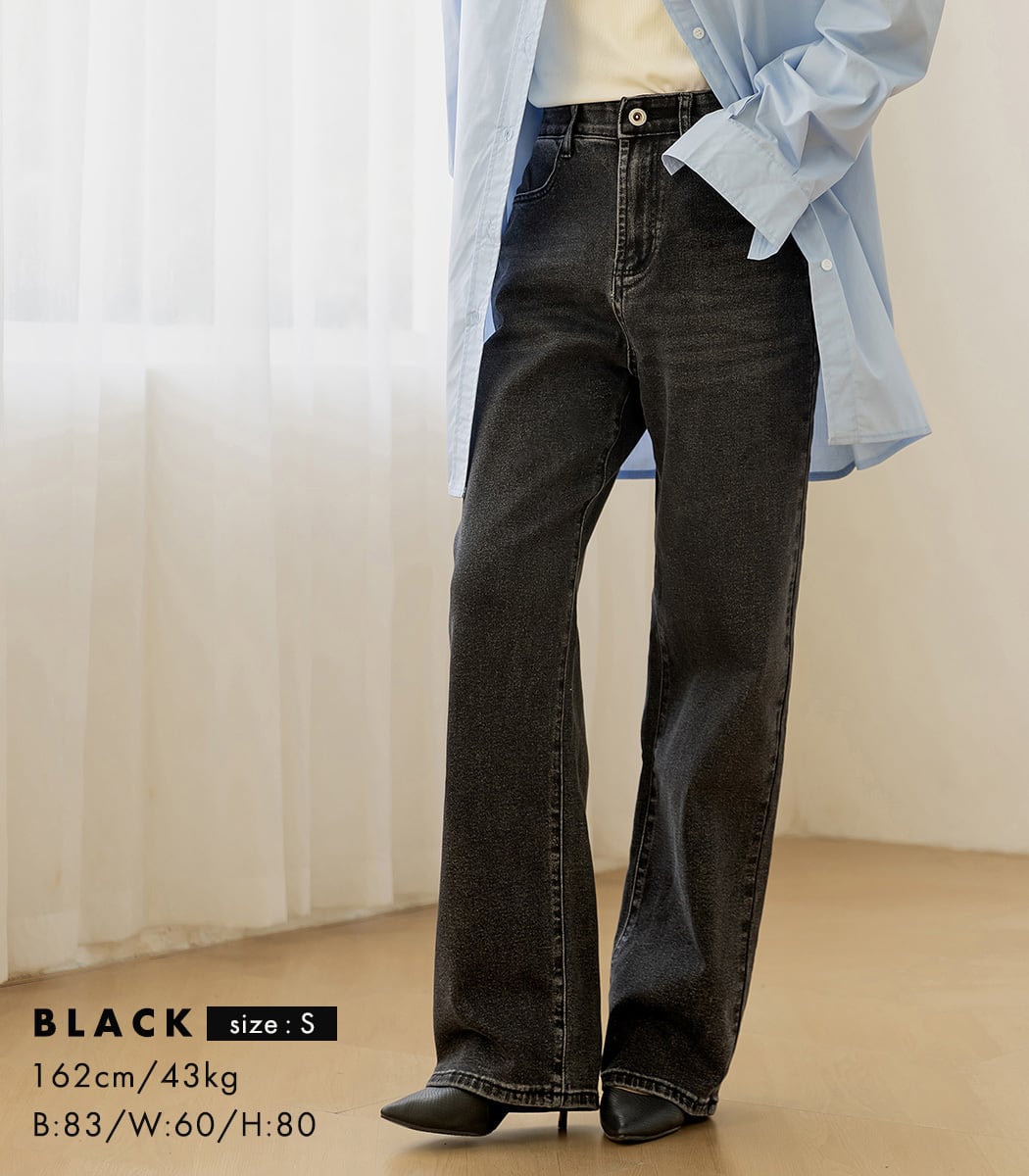 ゆったりとしたストレートシルエットで美脚見せが叶う。