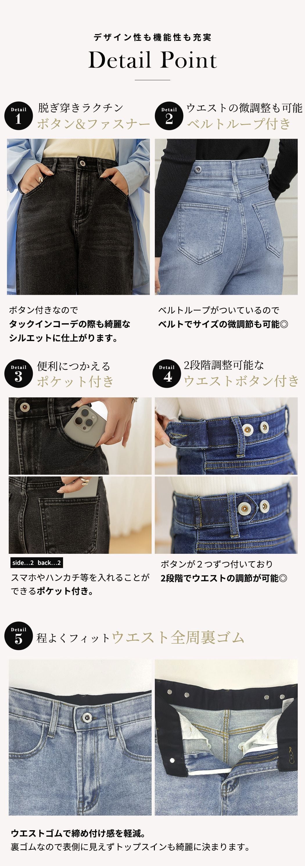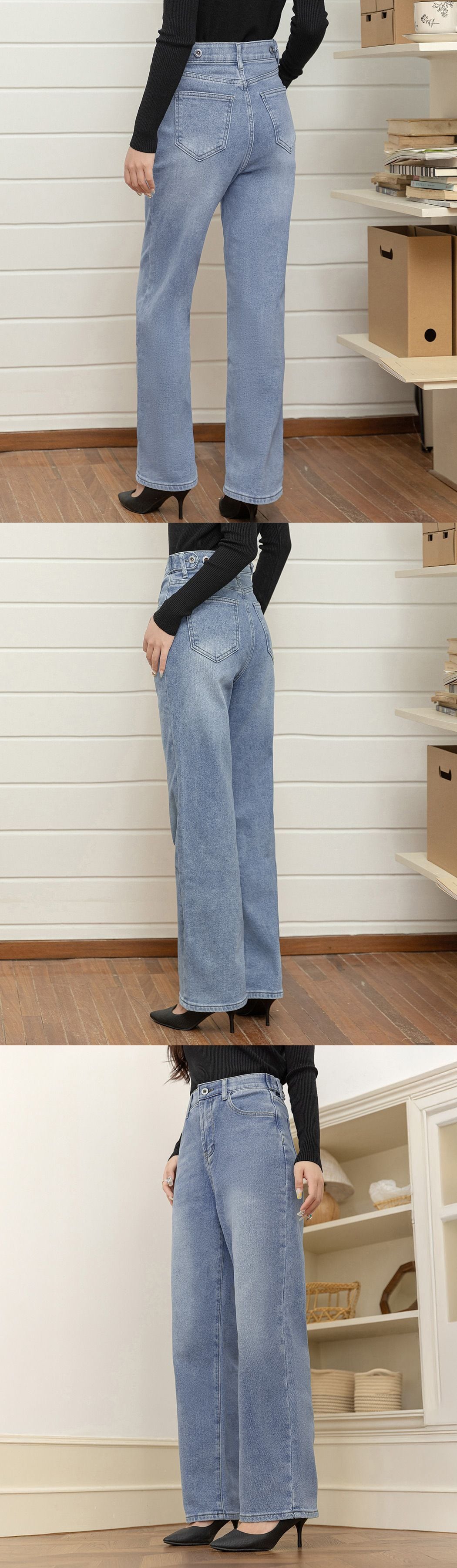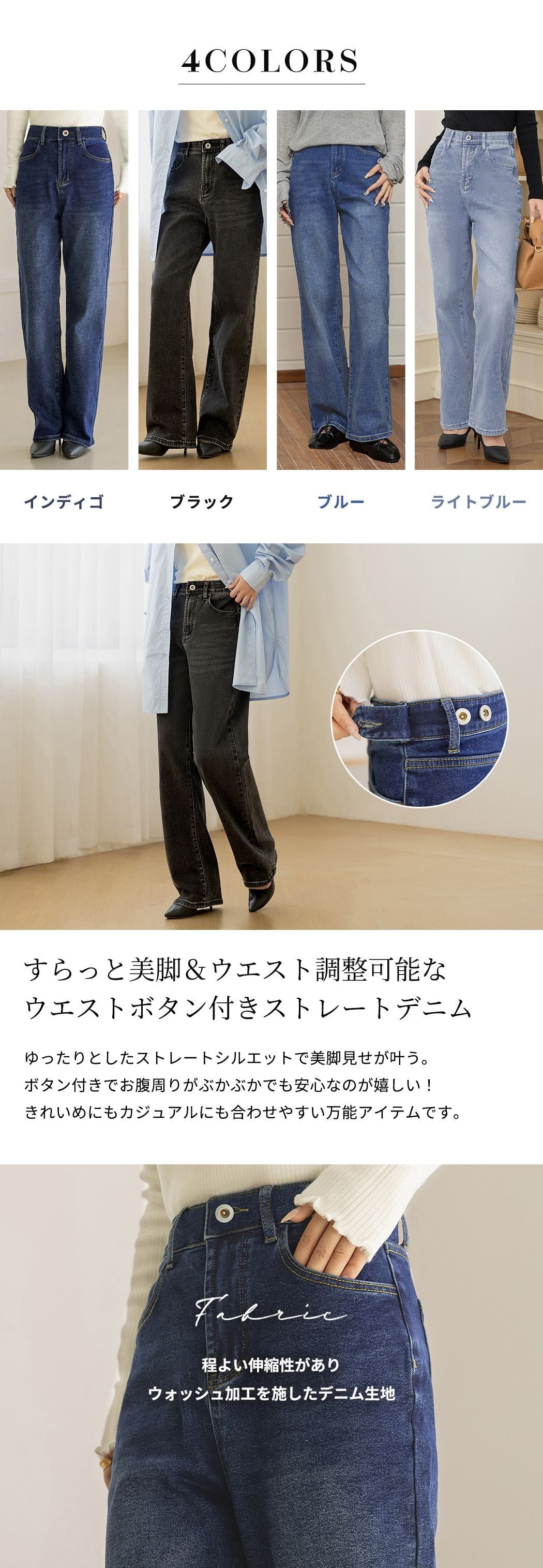 すらっと美脚&ウエスト調整可能なウエストボタン付きストレートデニム