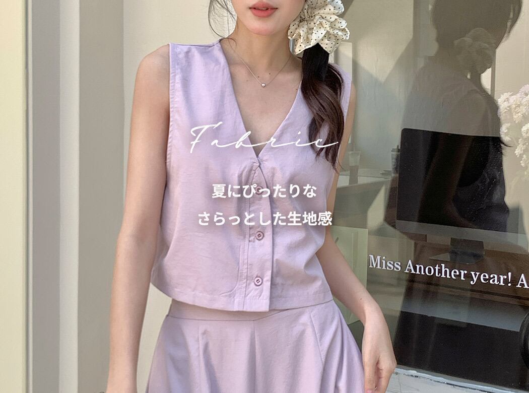 ショート丈のベストとハイウエストのワイドパンツで