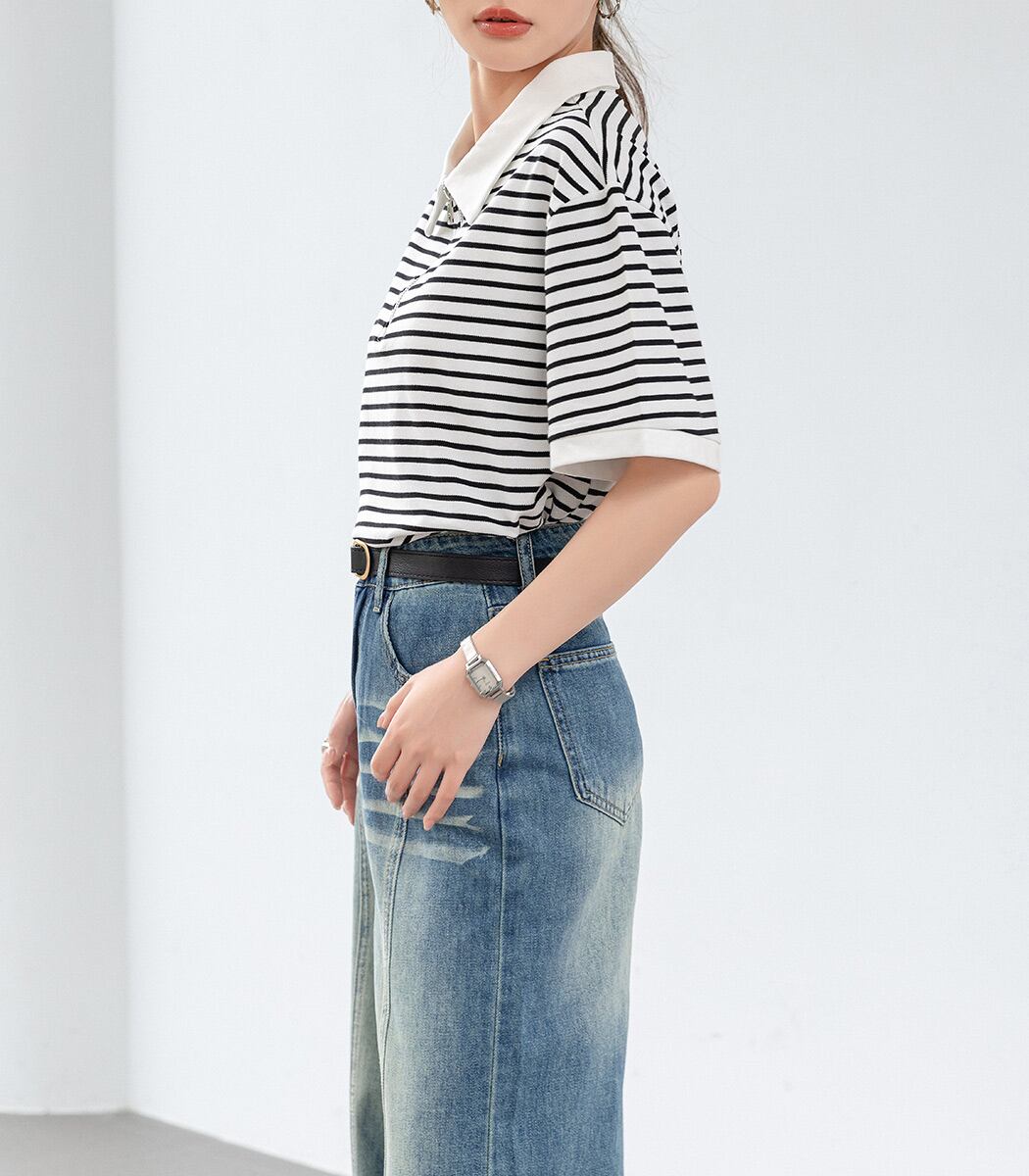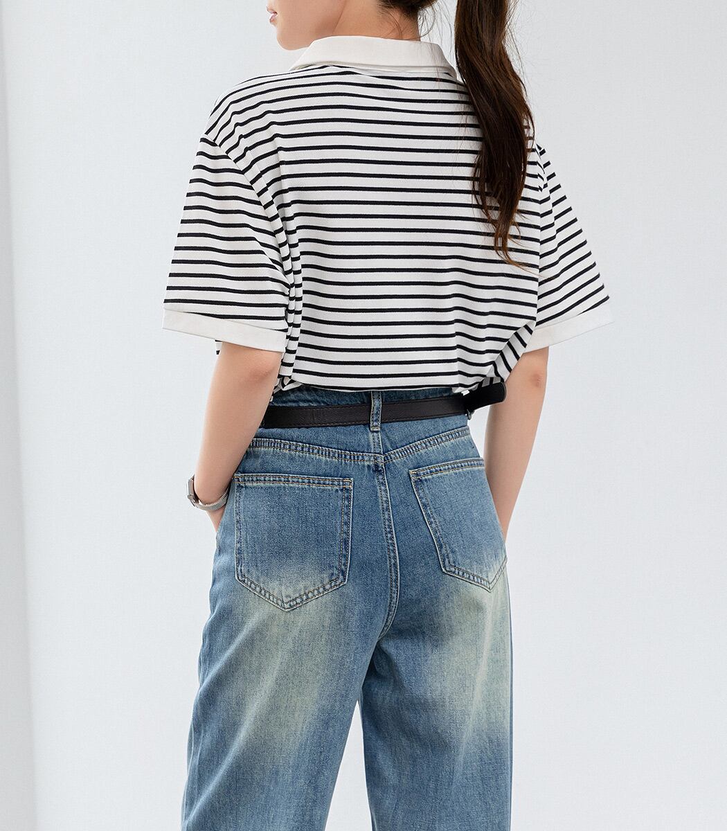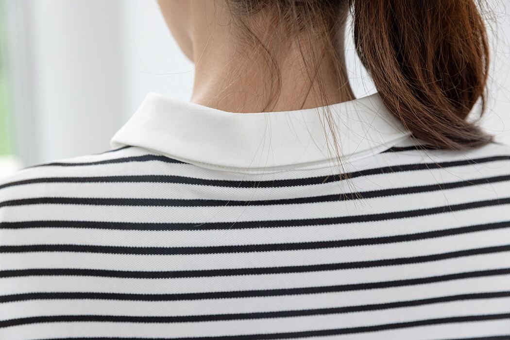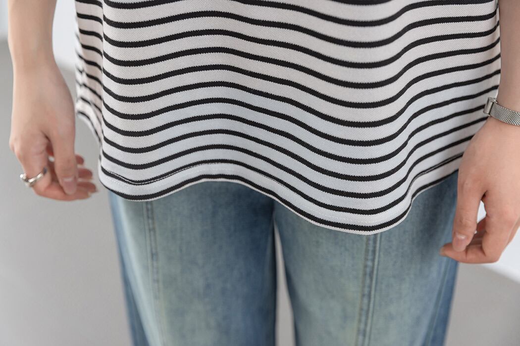 細めのボーダー柄なのでこなれ感がアップし、華奢見えも◎