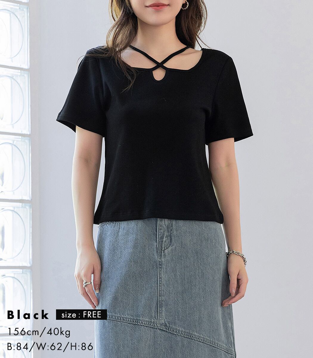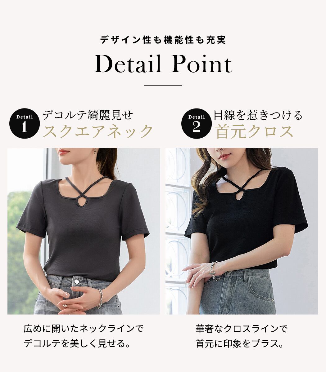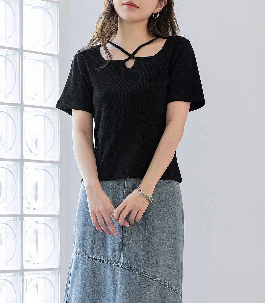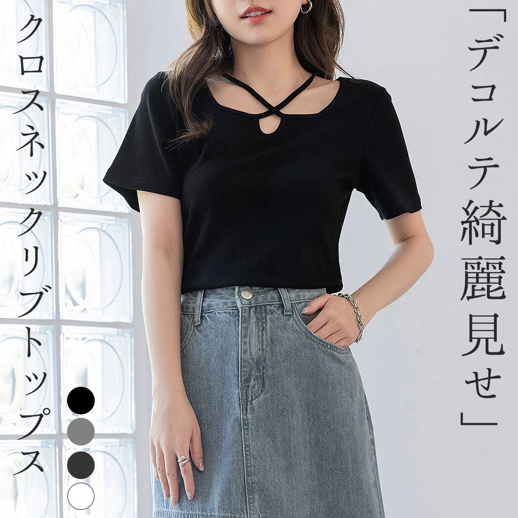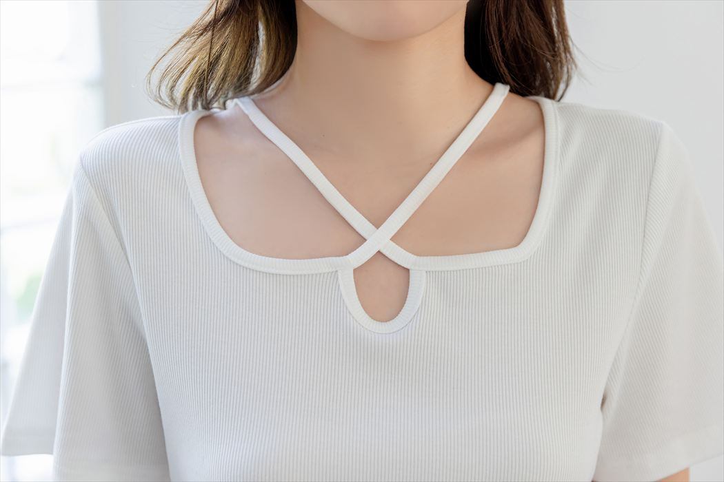 「デコルテ綺麗見せ」クロスネックリブトップス