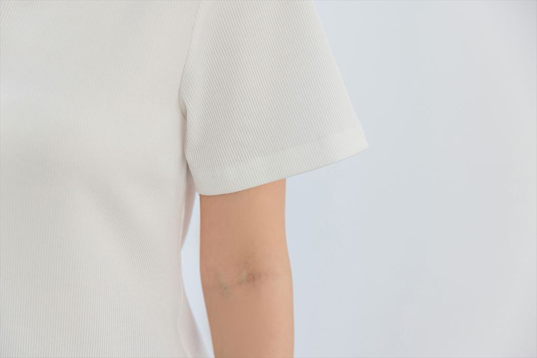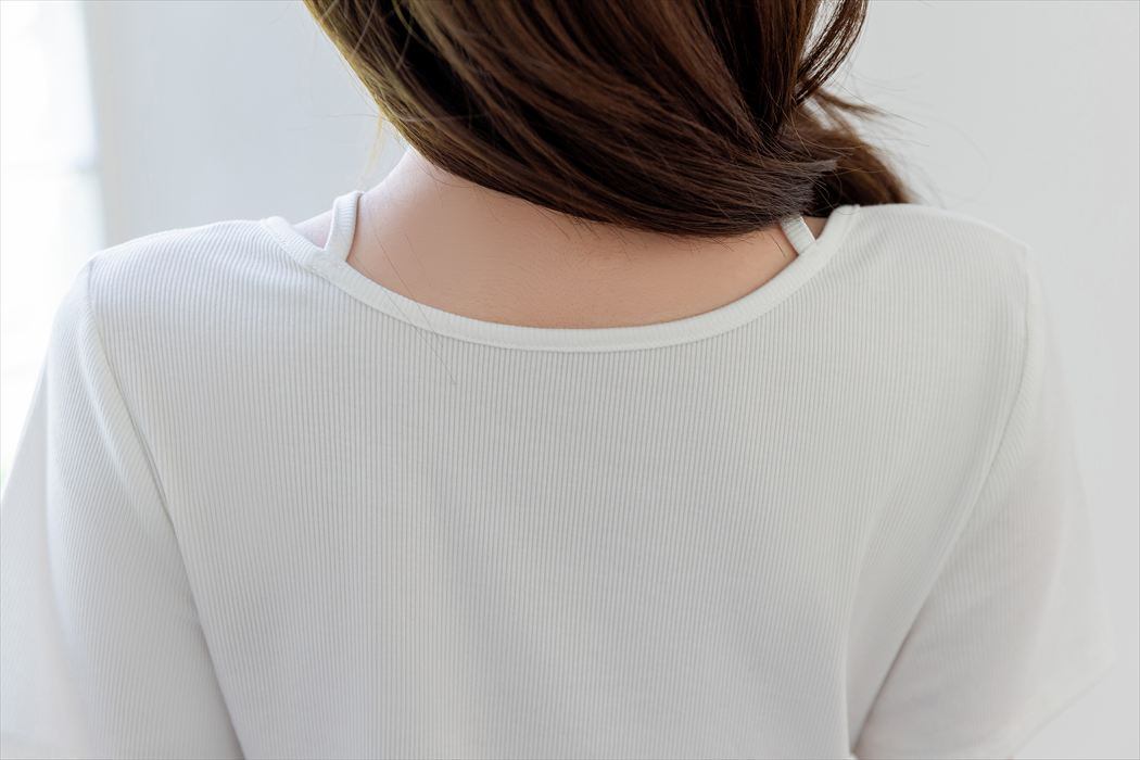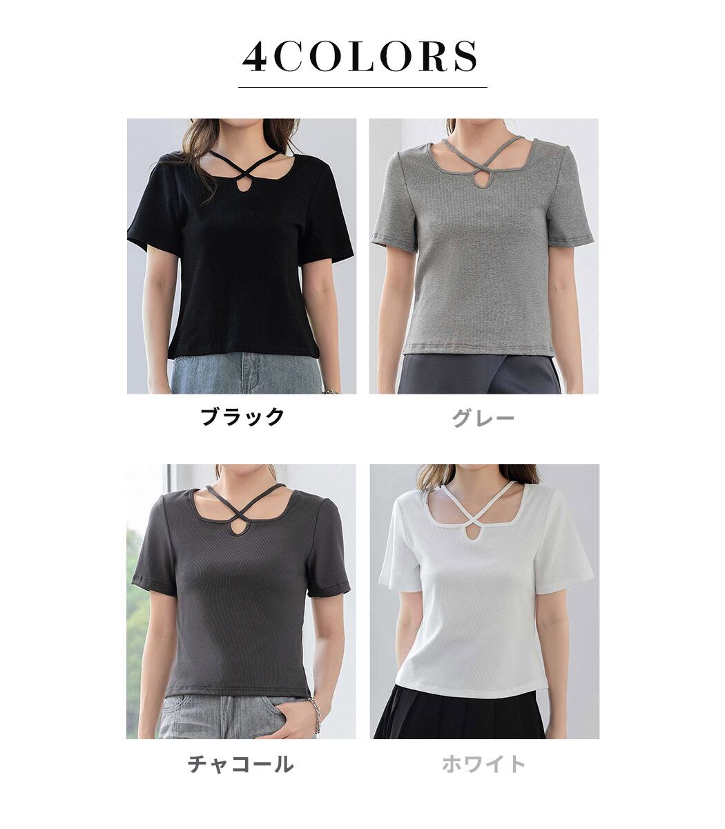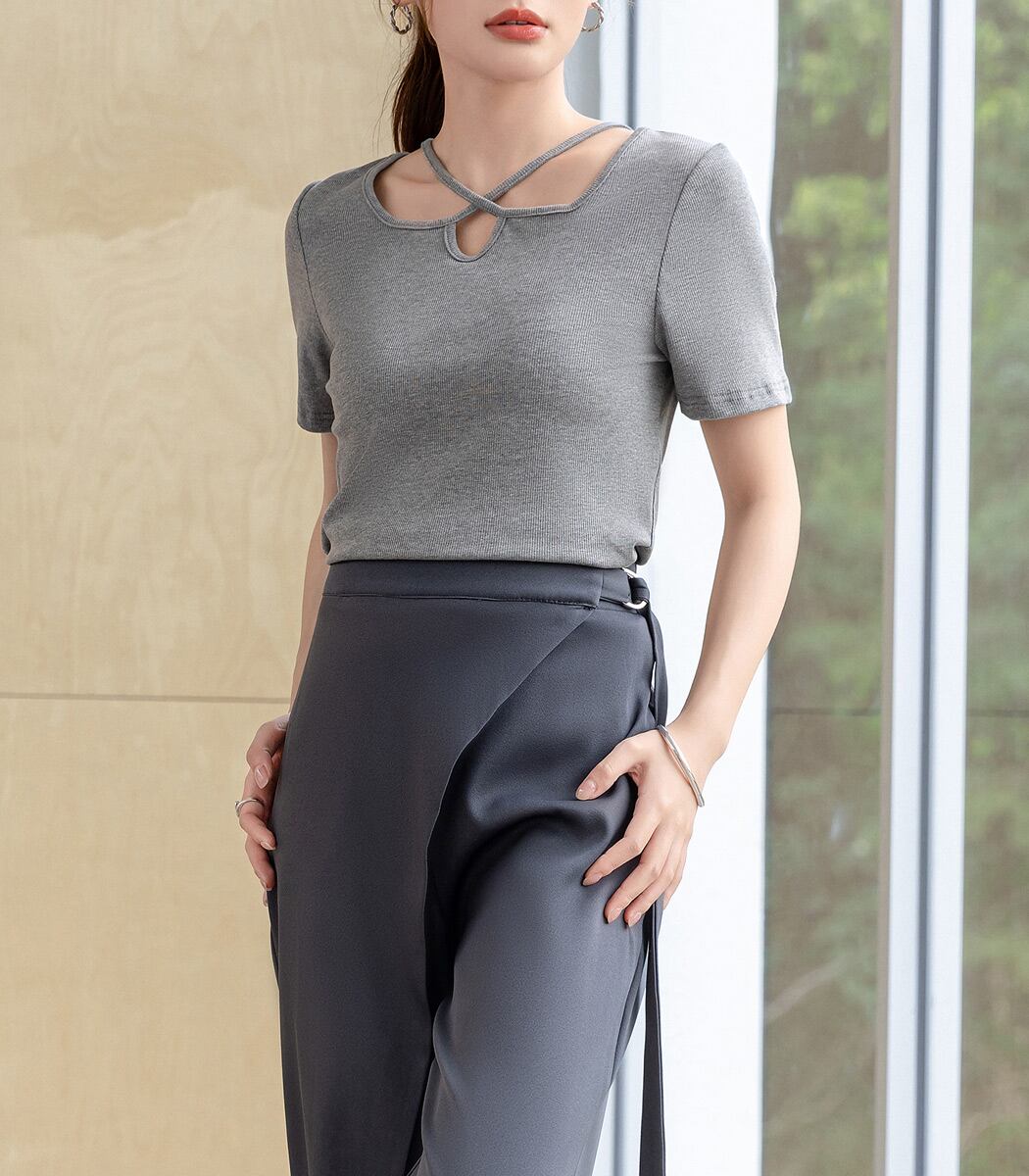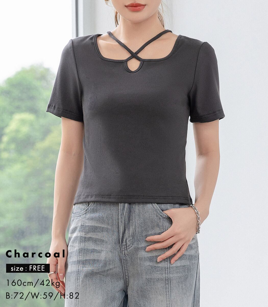 「デコルテ綺麗見せ」クロスネックリブトップス