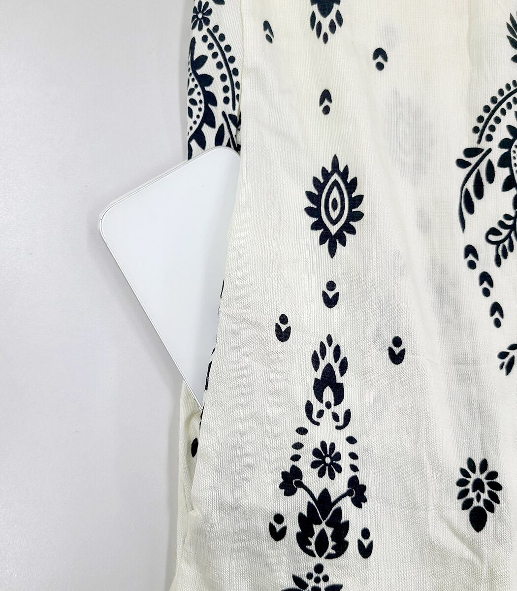 ふんわり軽やかな素材感と、繊細なダマスク柄プリントが