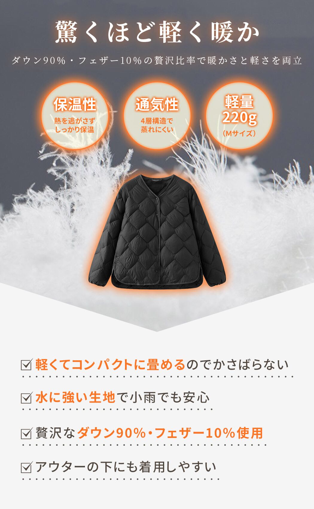 ダウン90%・フェザー10%の贅沢比率で暖かさと軽さを両立