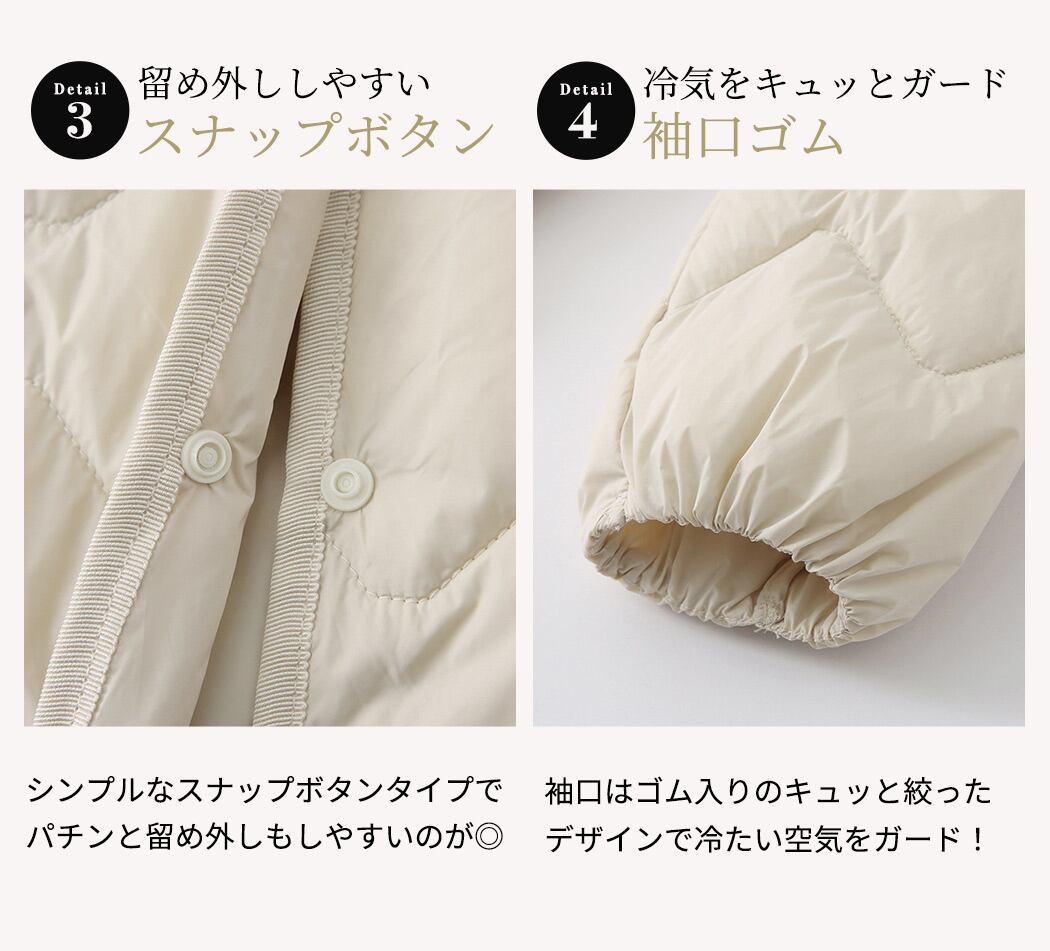 裏地:裏地を二重にすることで羽毛の抜け落ちを防止し保温性もアップ