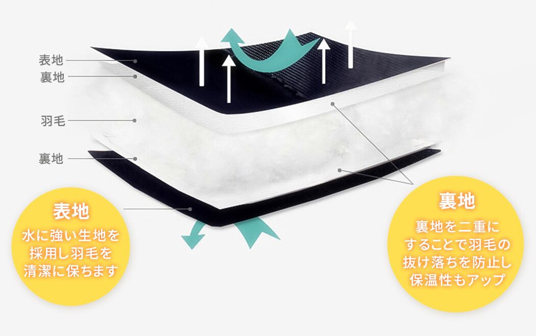 表地:水に強い生地を採用し羽毛を清潔に保ちます