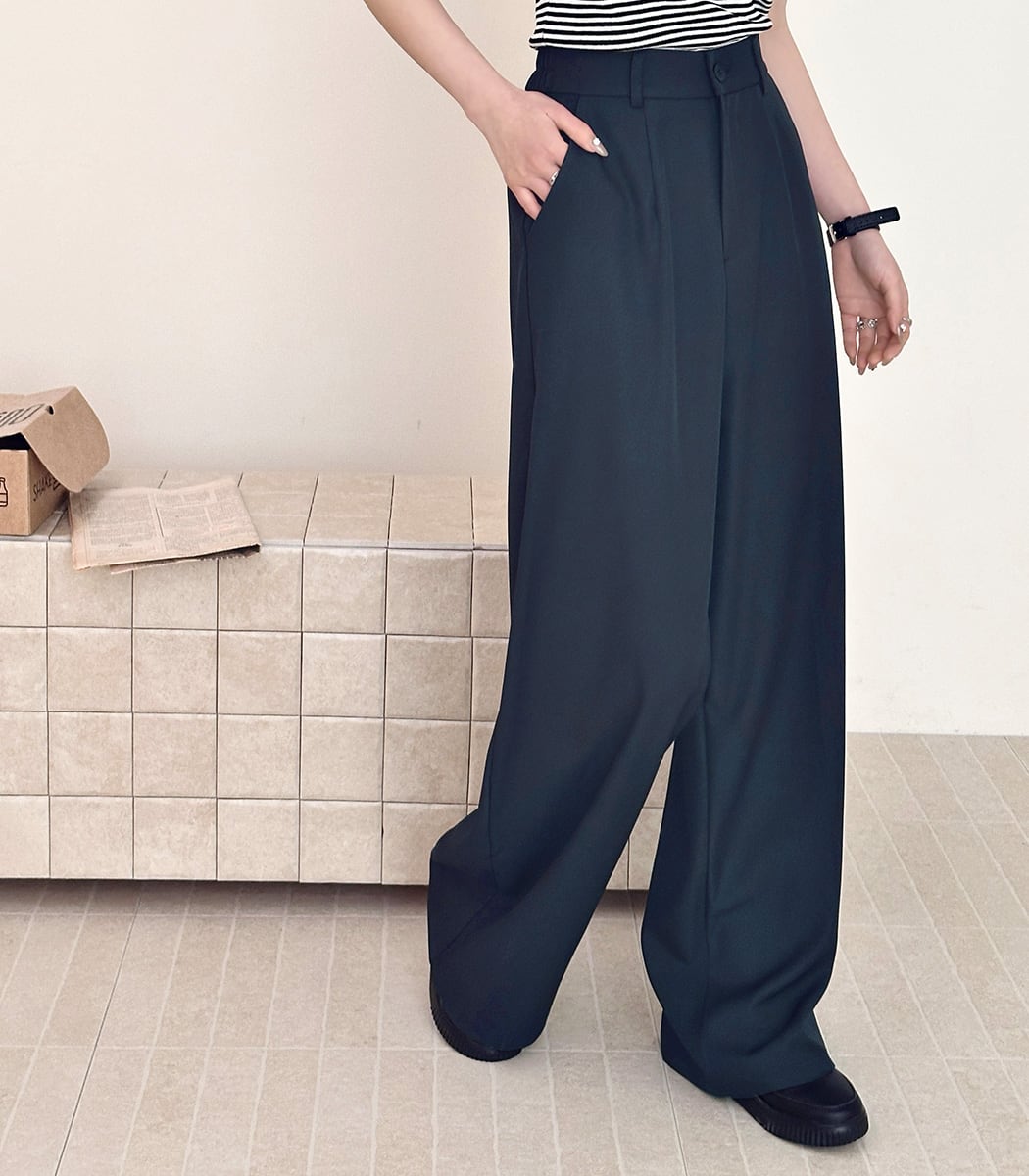 ハイウエストとワンタックで腰回りはすっきり、