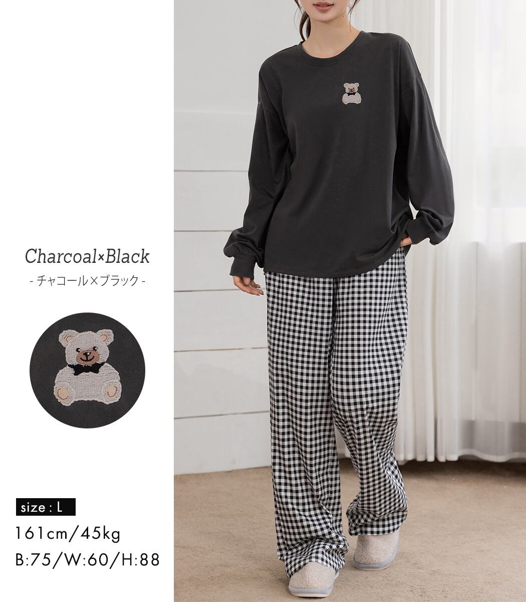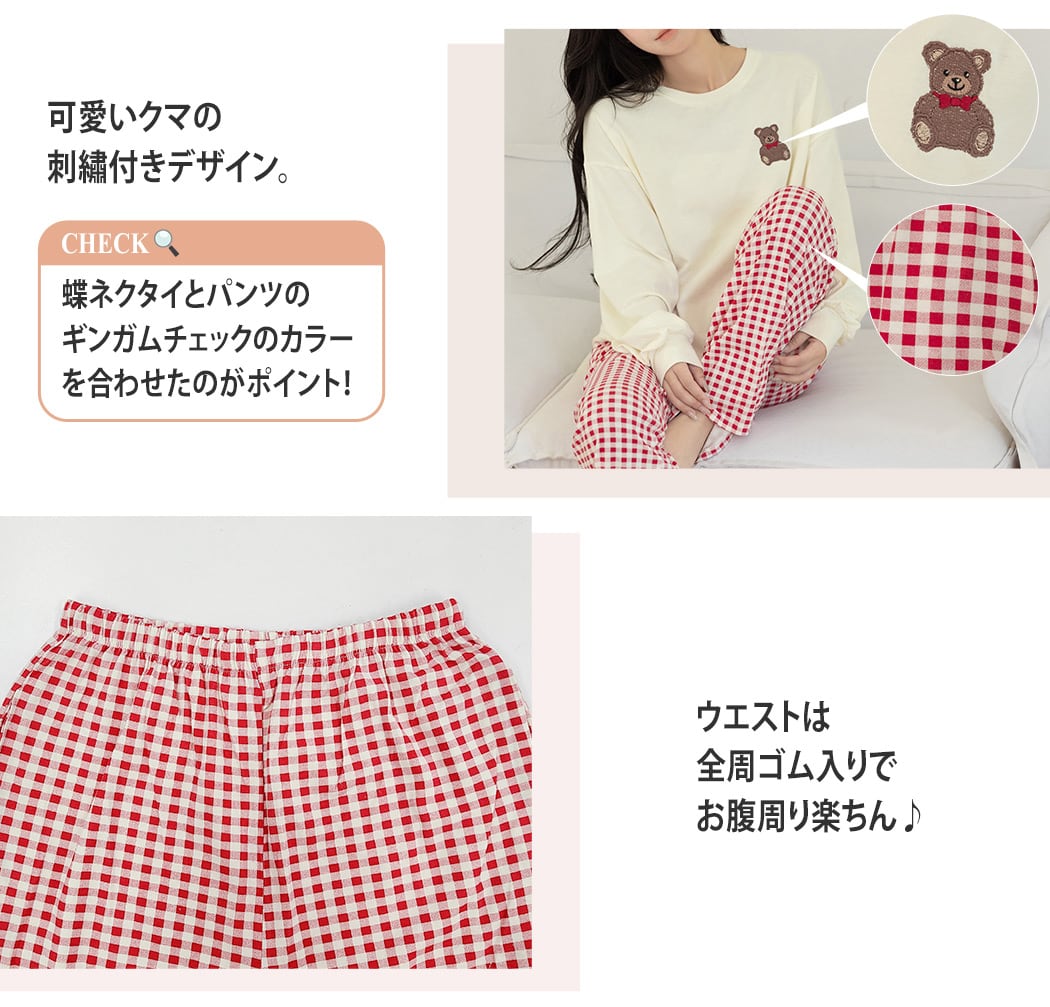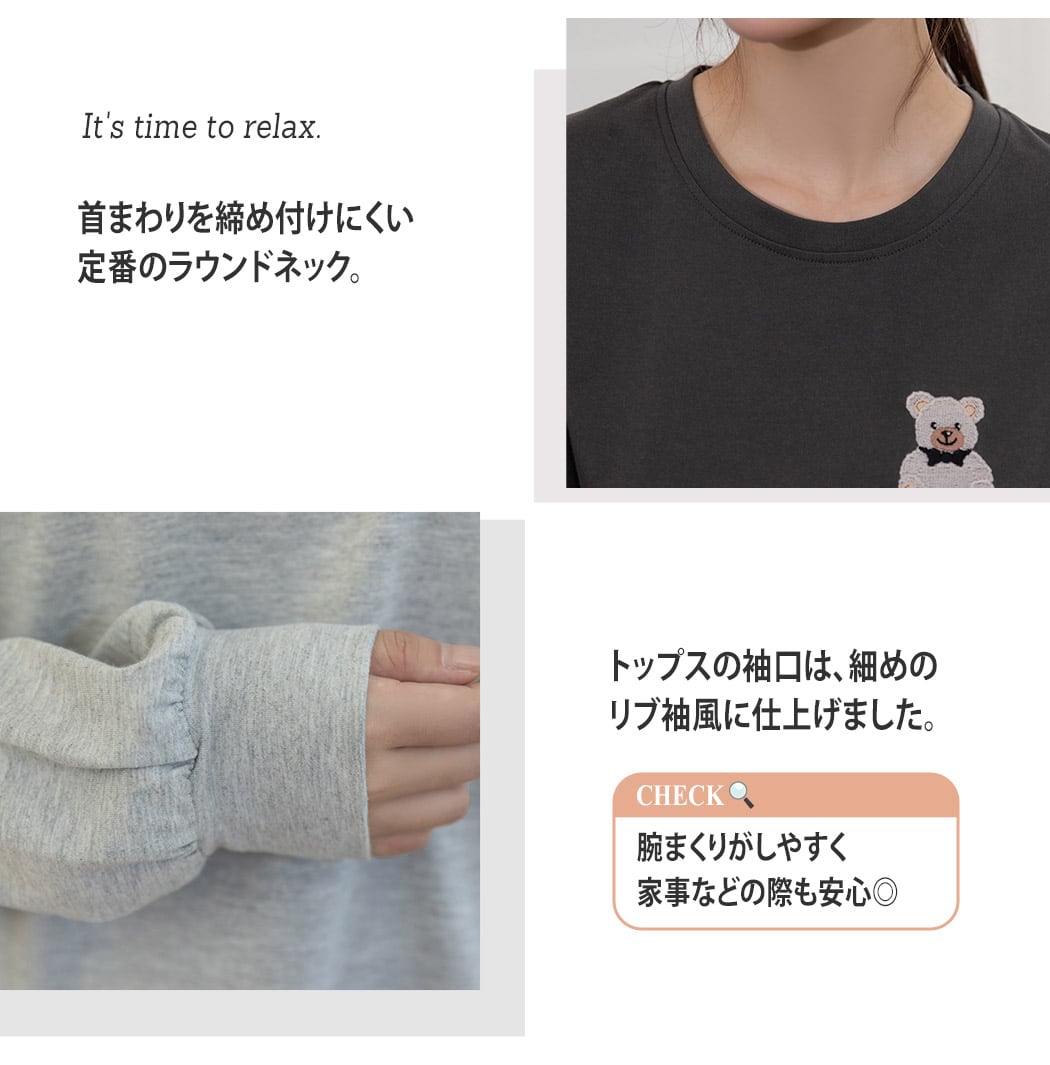 蝶ネクタイを付けた刺繍テディベアが可愛いルームウェア。