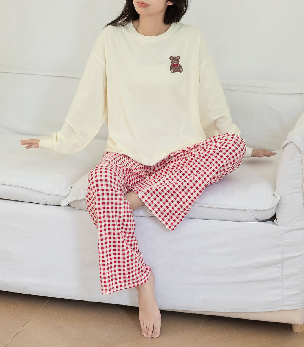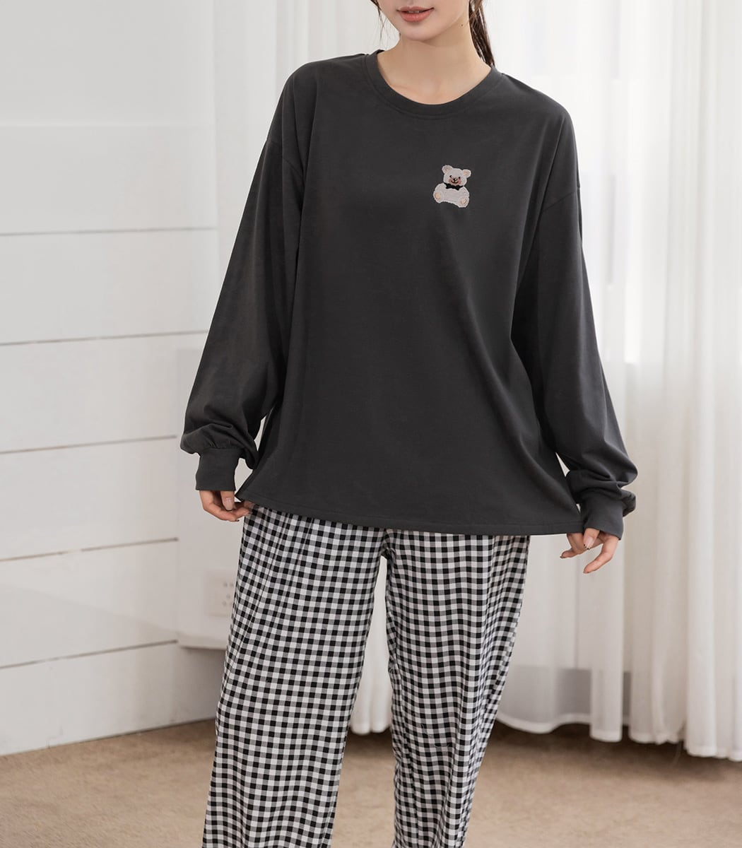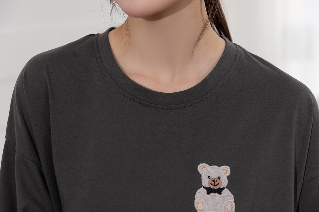 蝶ネクタイを付けた刺繍テディベアが可愛いルームウェア。