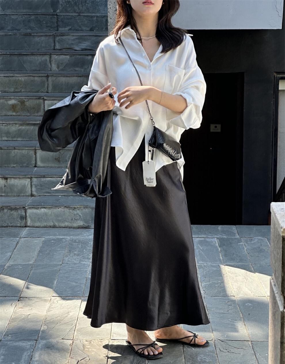 ロング丈のサテンスカート