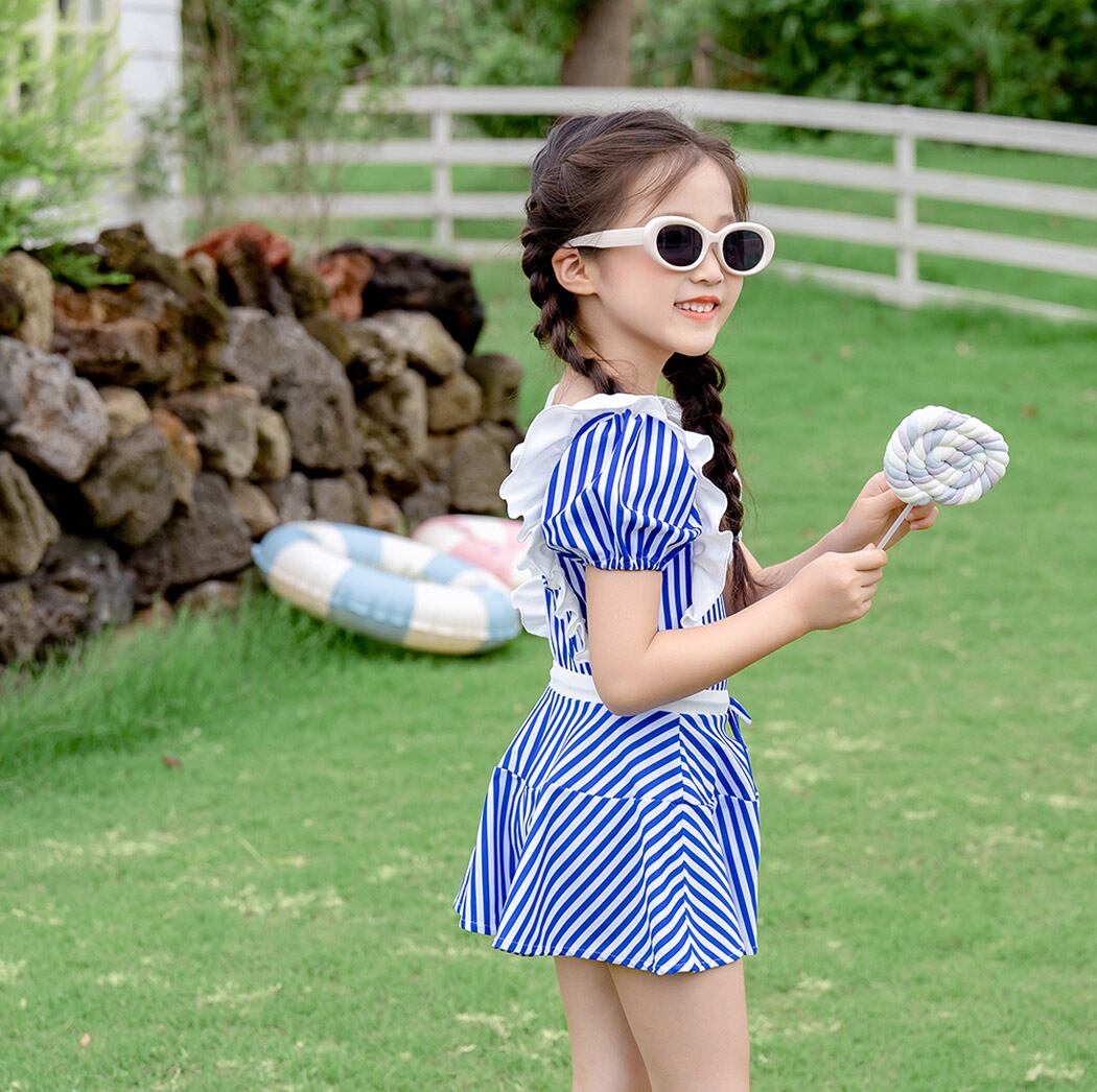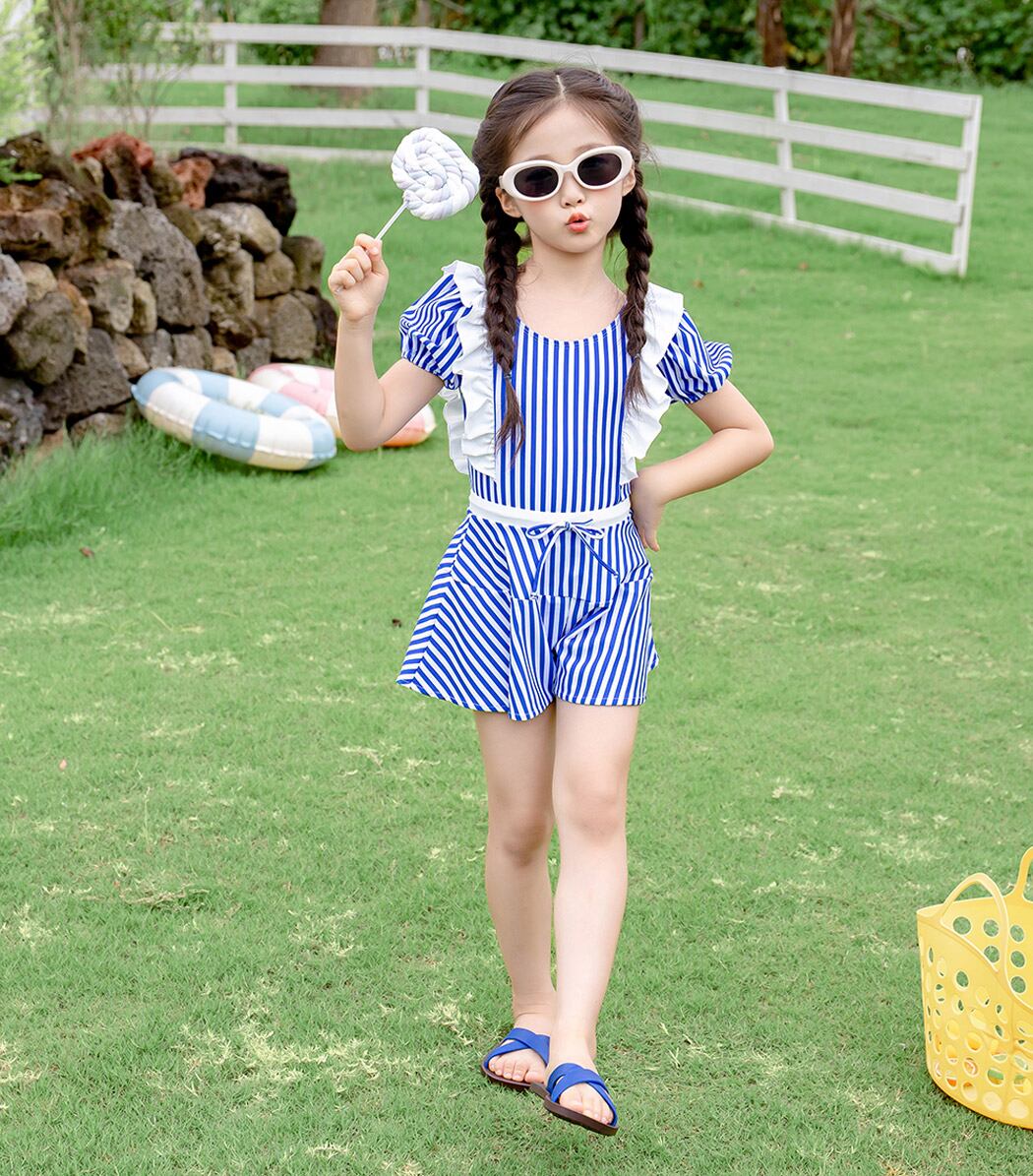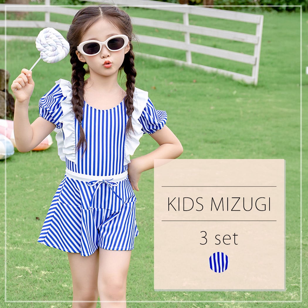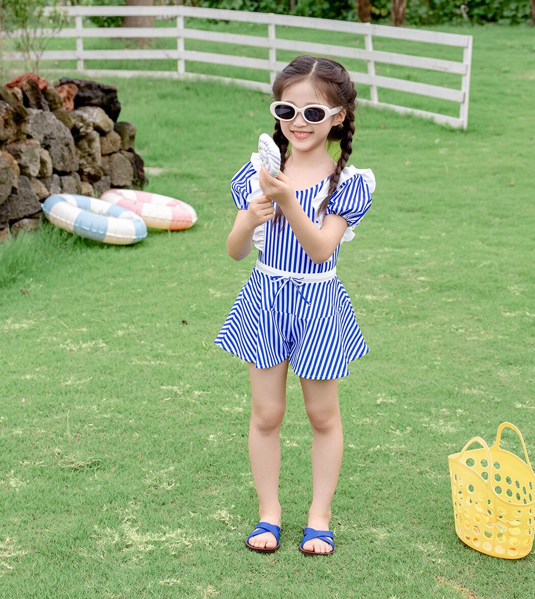 ブルーのストライプが夏らしい肩元のフリルが映えるデザイン