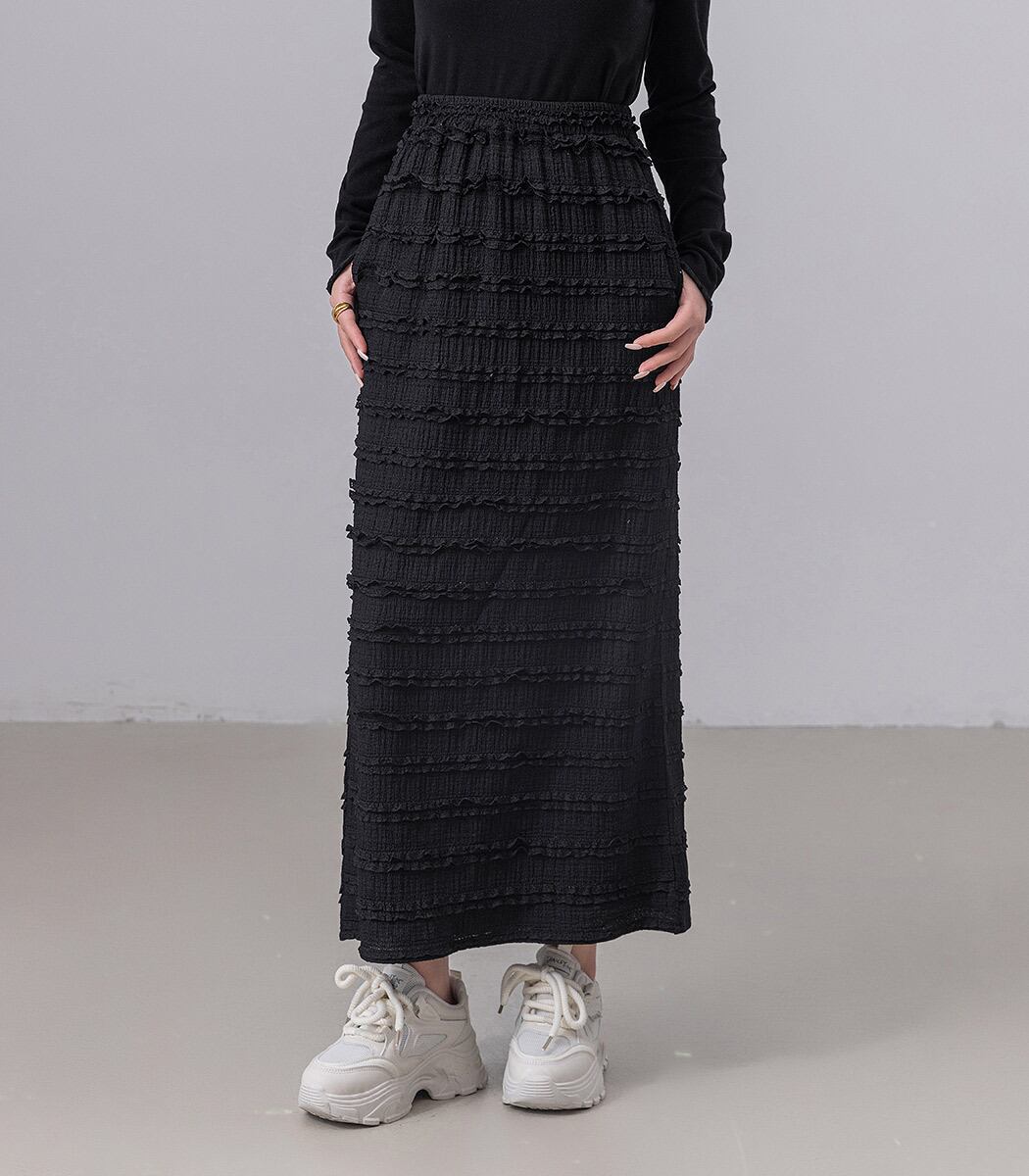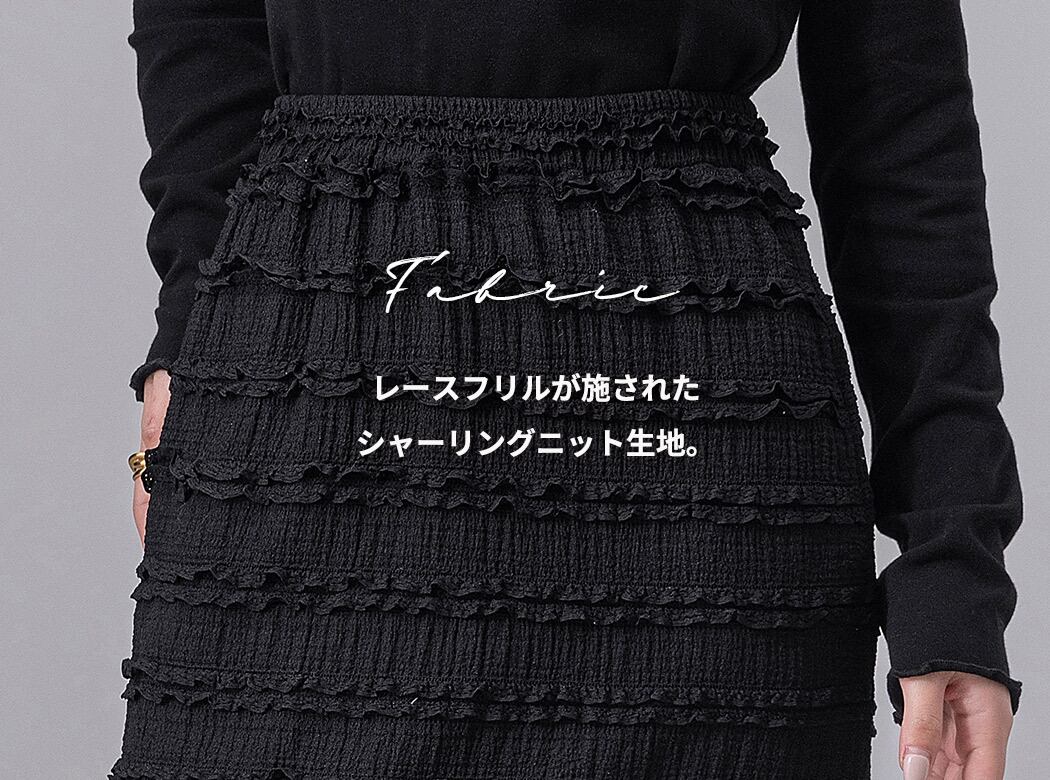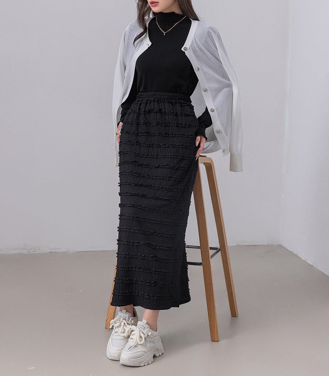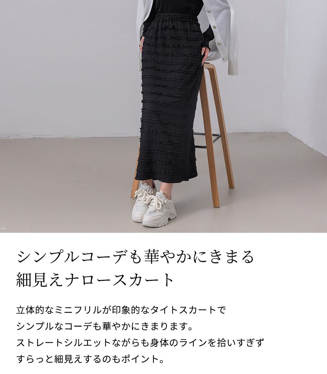 立体的なミニフリルが印象的なタイトスカートでシンプルなコーデも華やかにきまります。