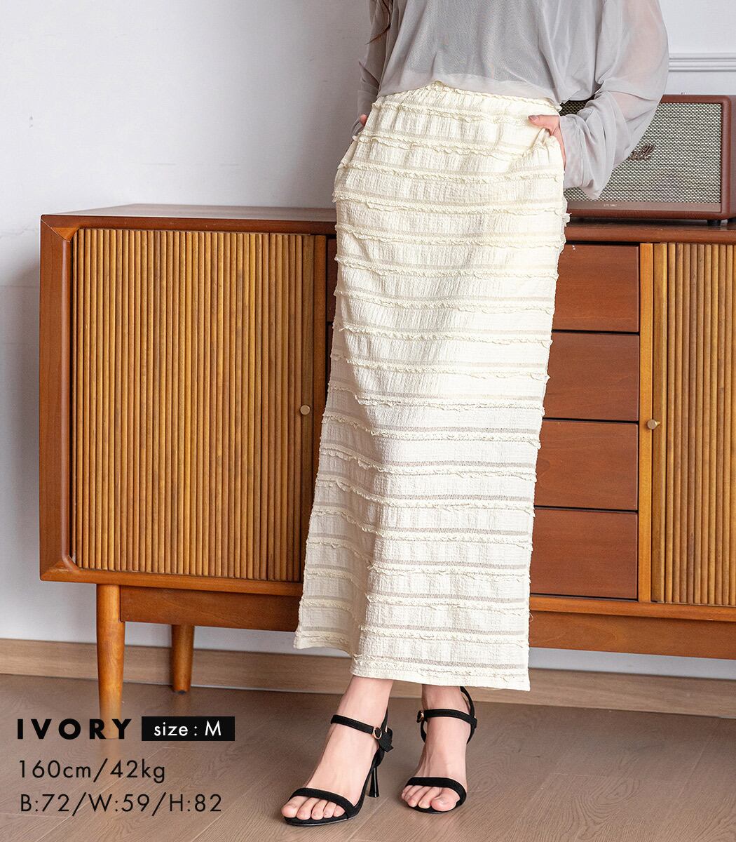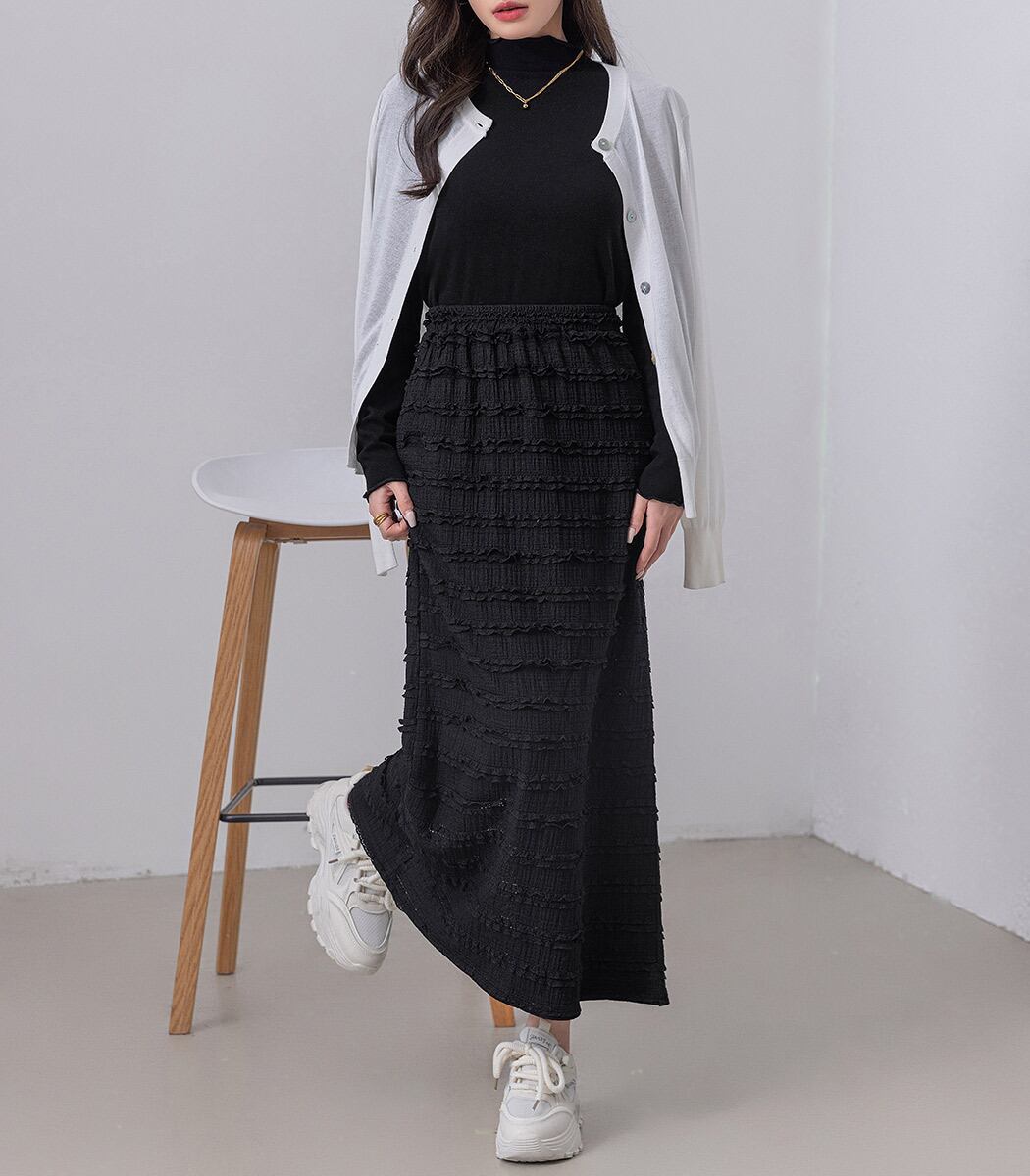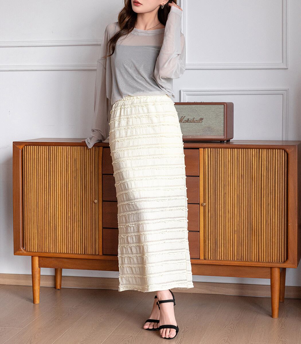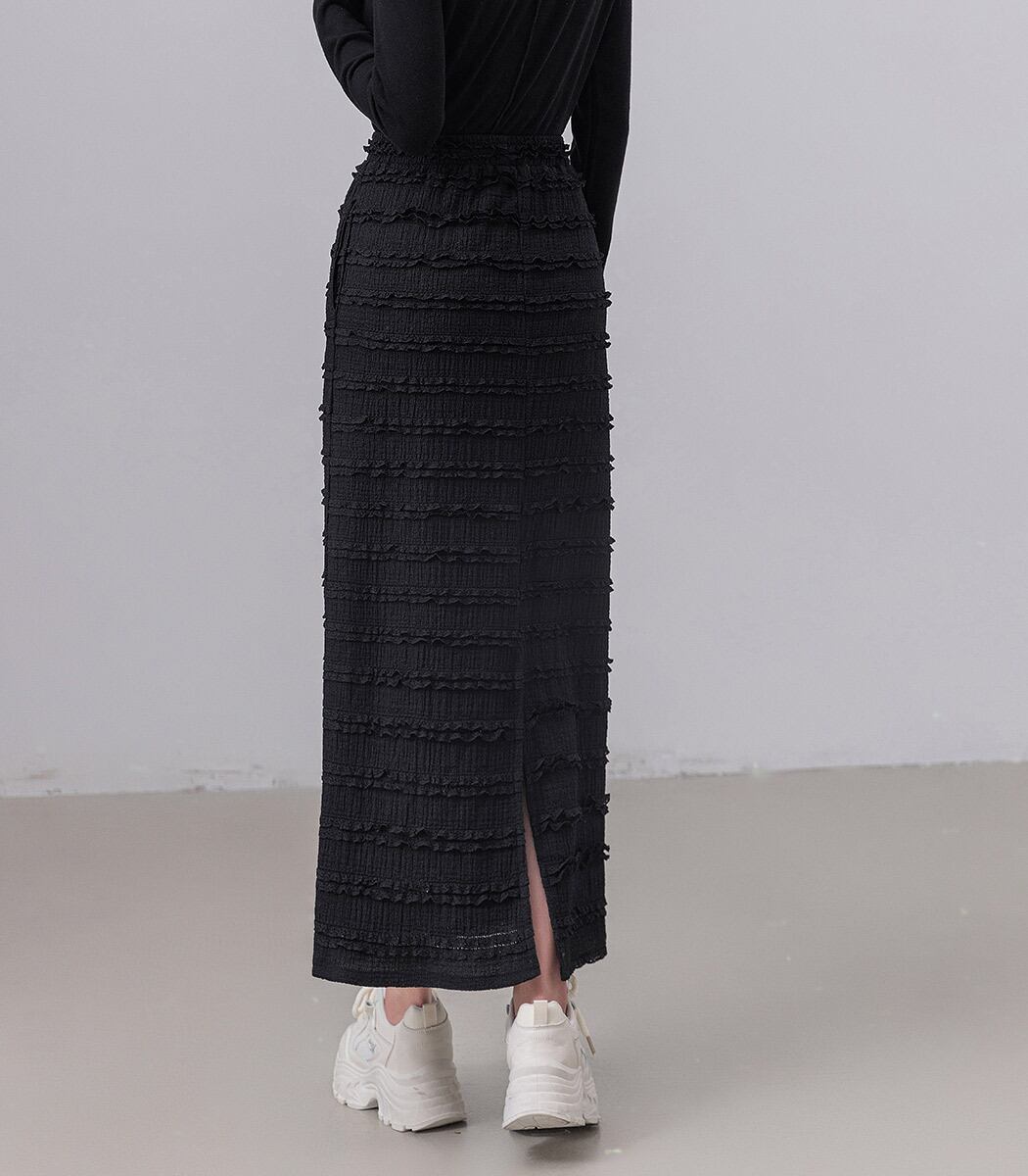 立体的なミニフリルが印象的なタイトスカートでシンプルなコーデも華やかにきまります。