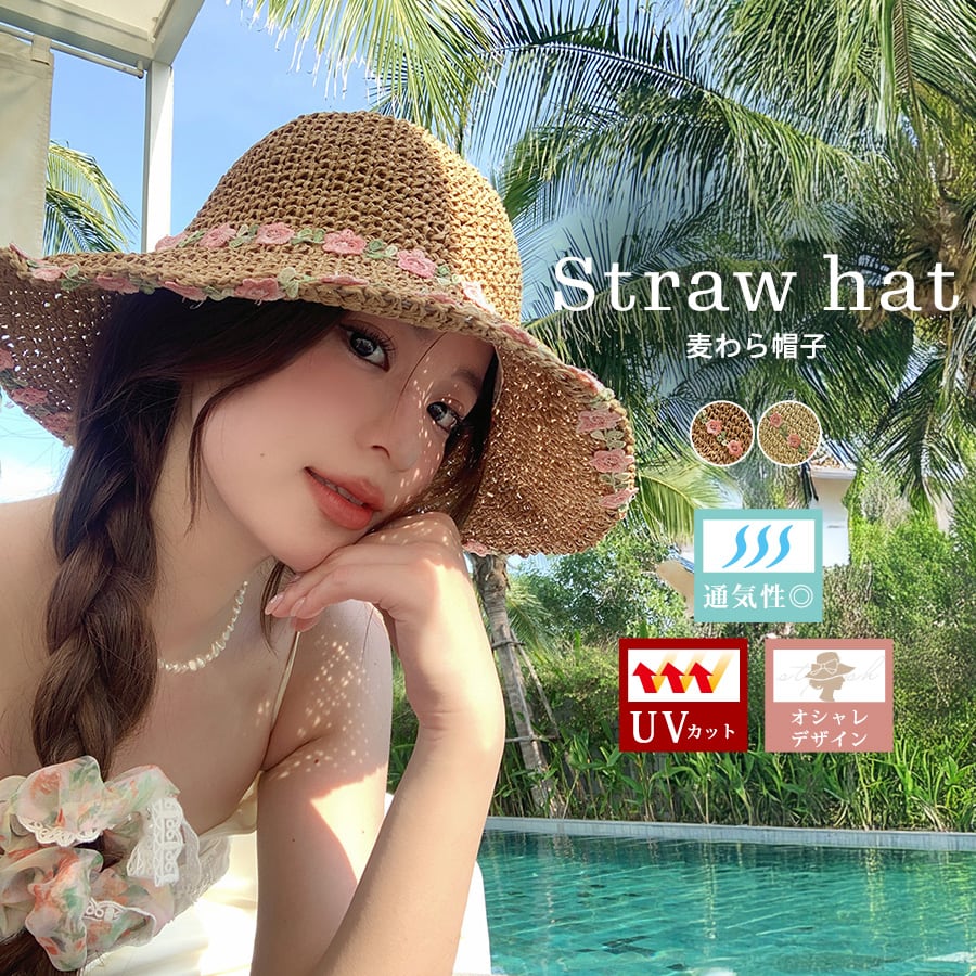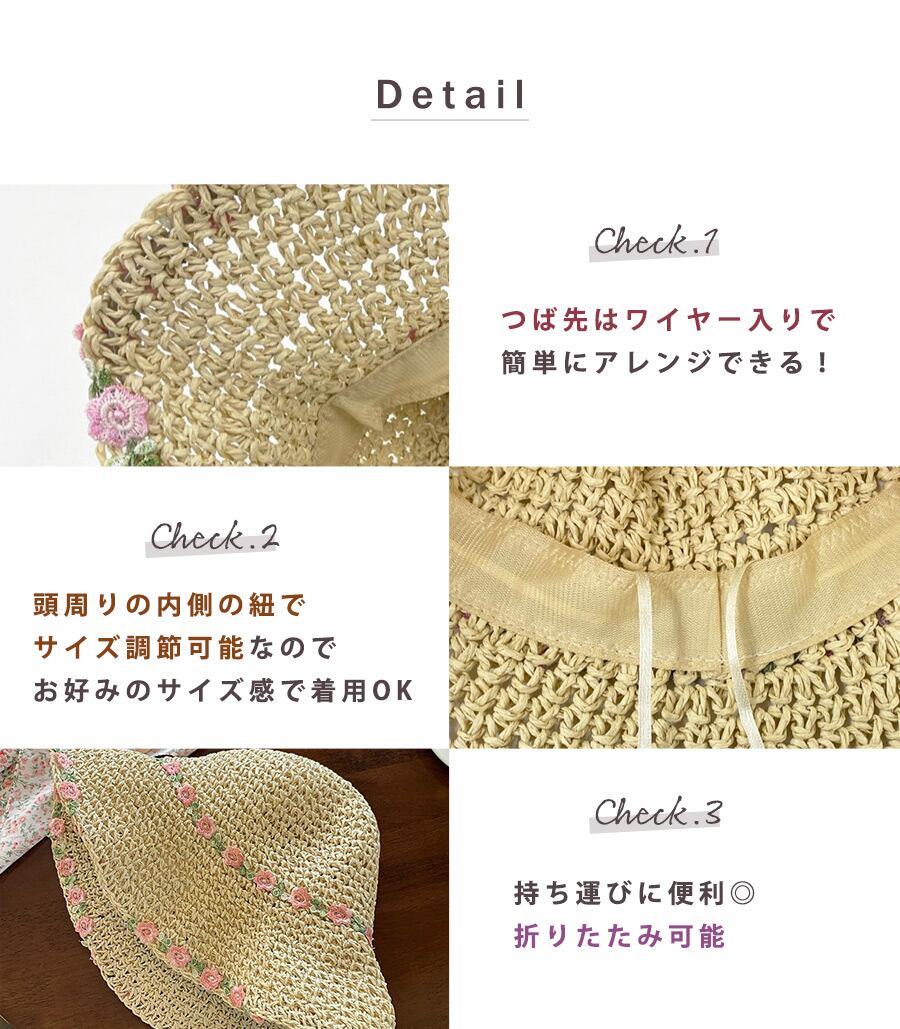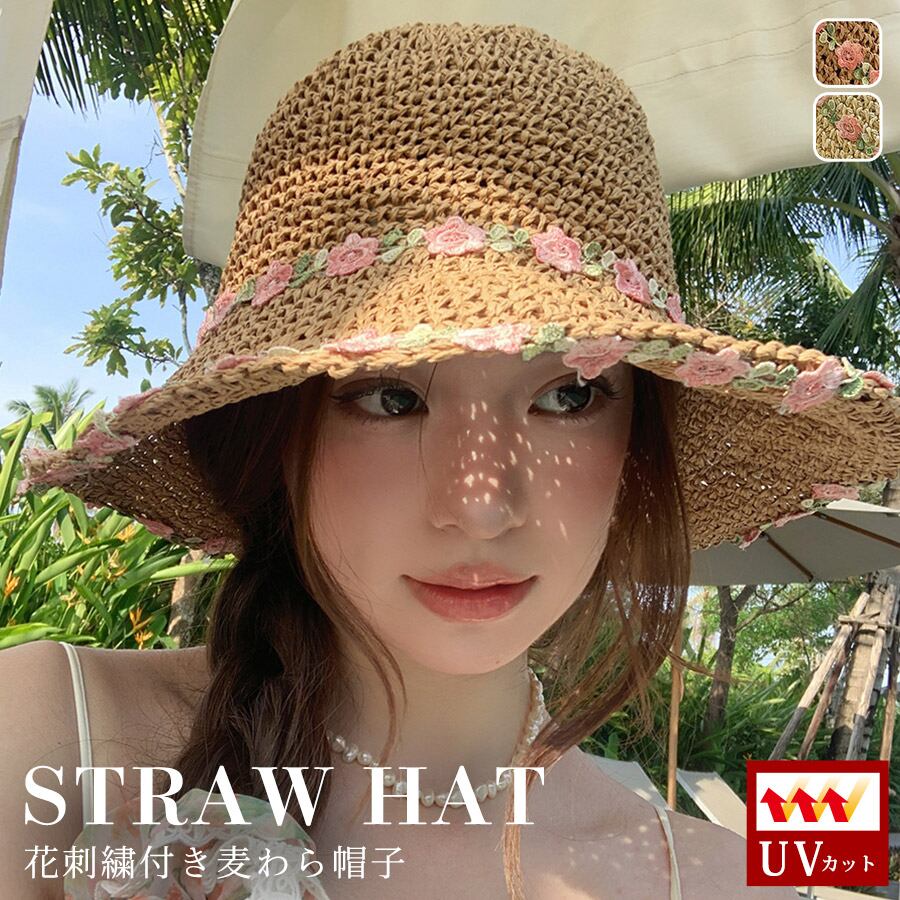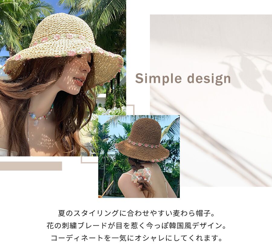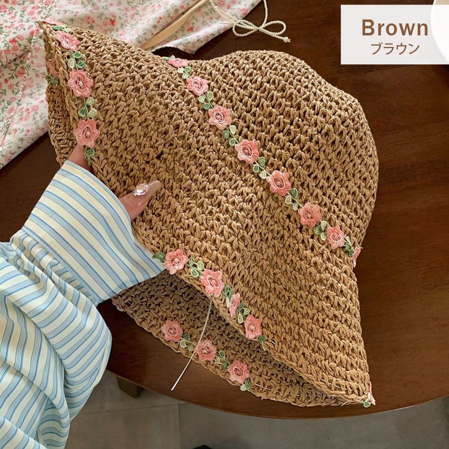 花刺繍付き麦わら帽子