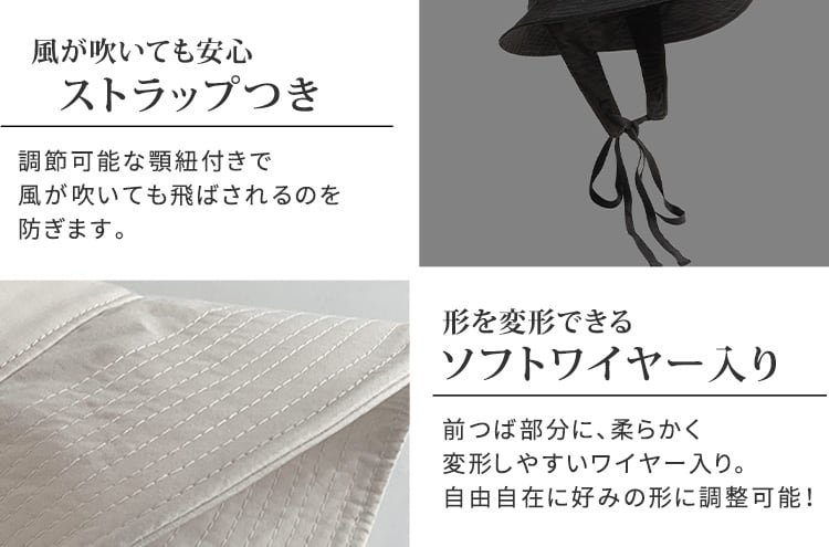 ツバ広デザインでお顔を幅広く紫外線からカバー。