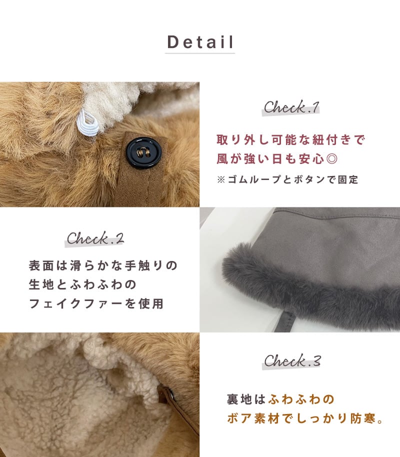 裏地はふわふわのボア素材でしっかり防寒。