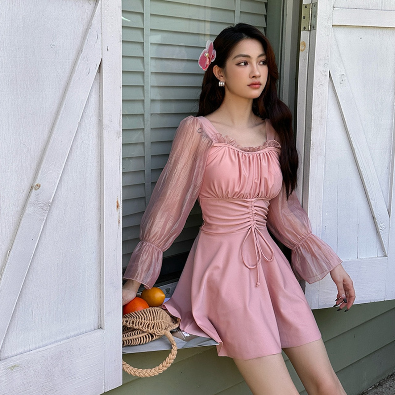 シアー袖&リボンでバレエコアテイストに仕上げました。