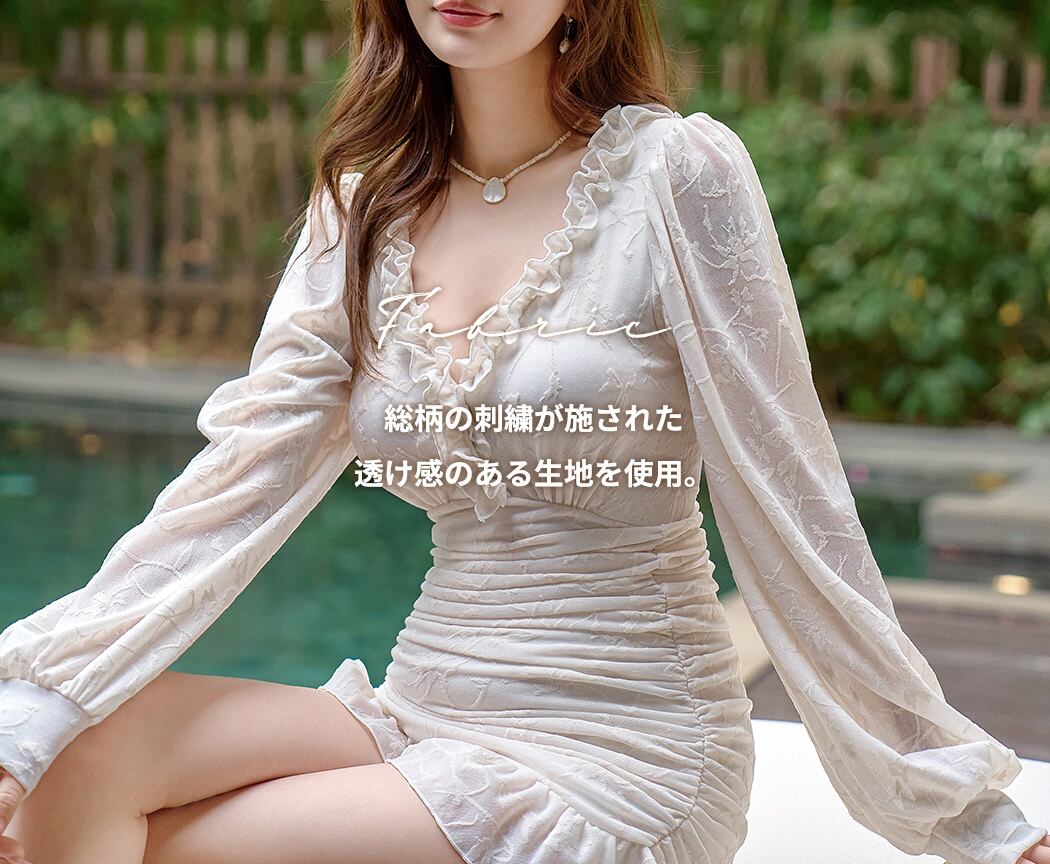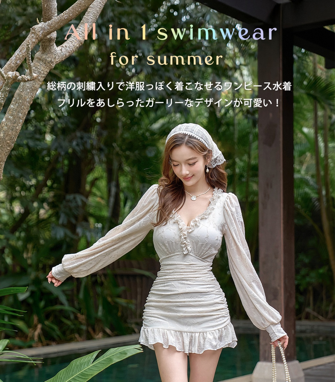 総柄の刺繍入りで洋服っぽく着こなせるワンピース水着