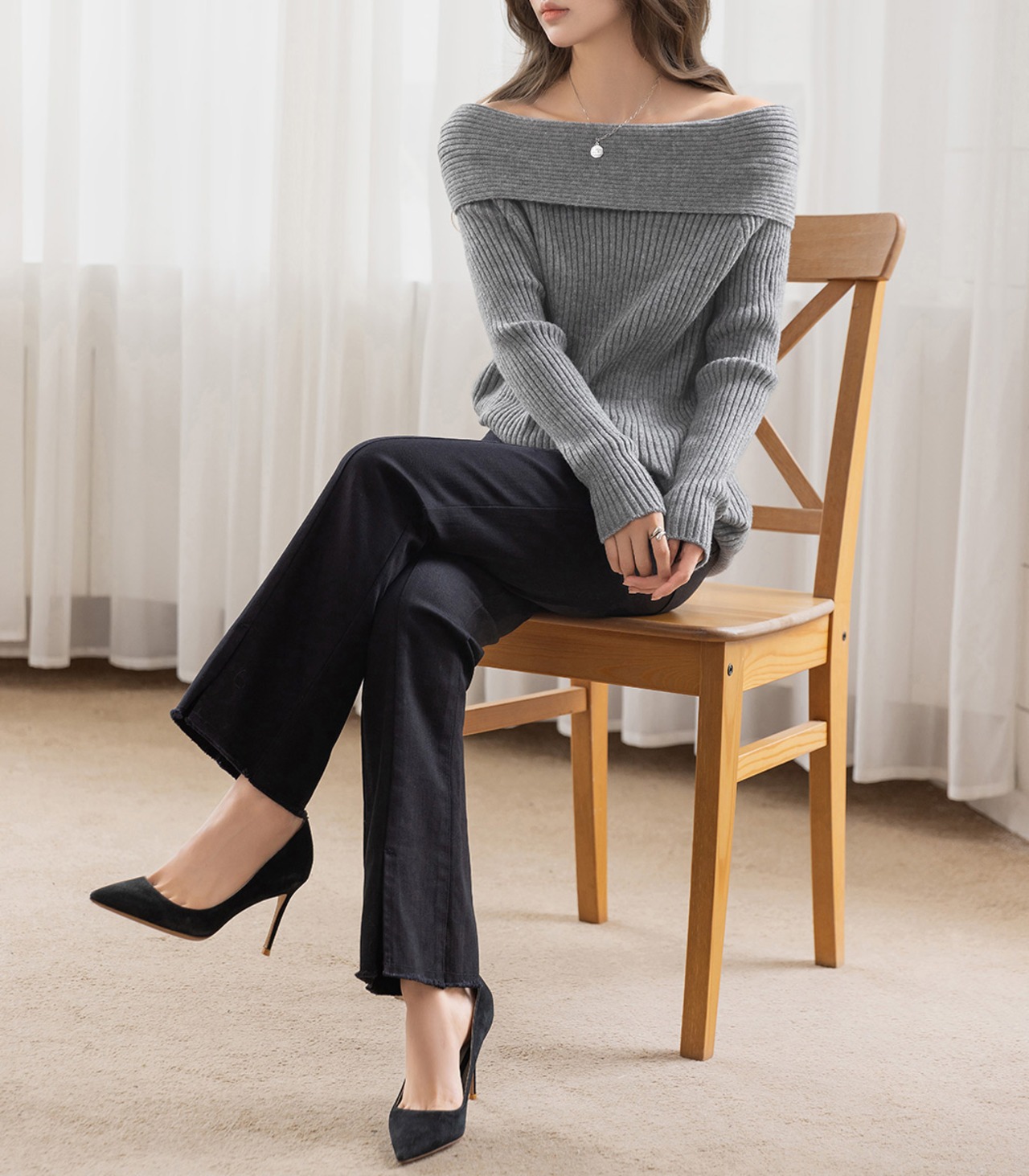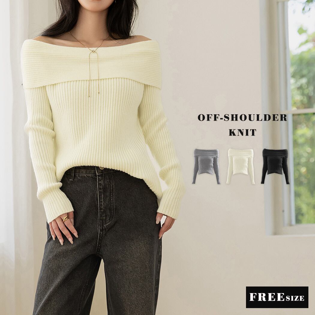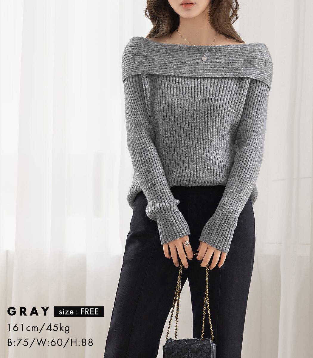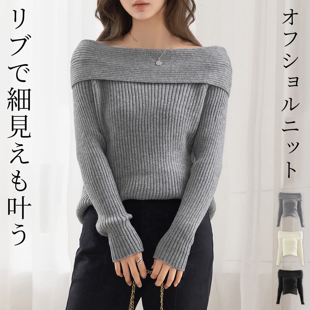 肩見せで大人の抜け感が出せるオフショルリブニット