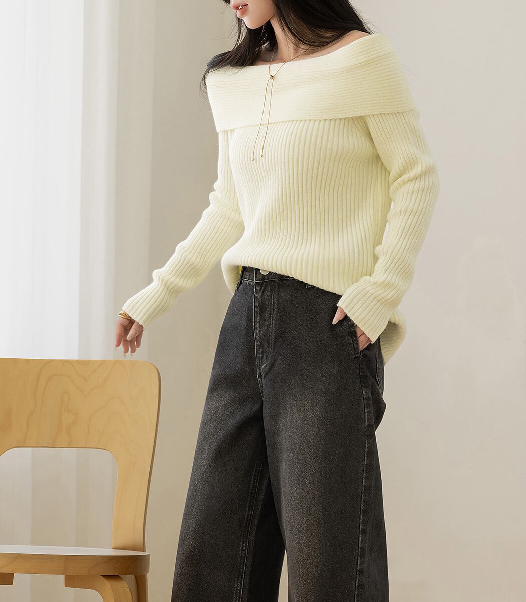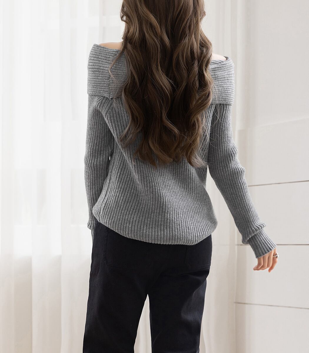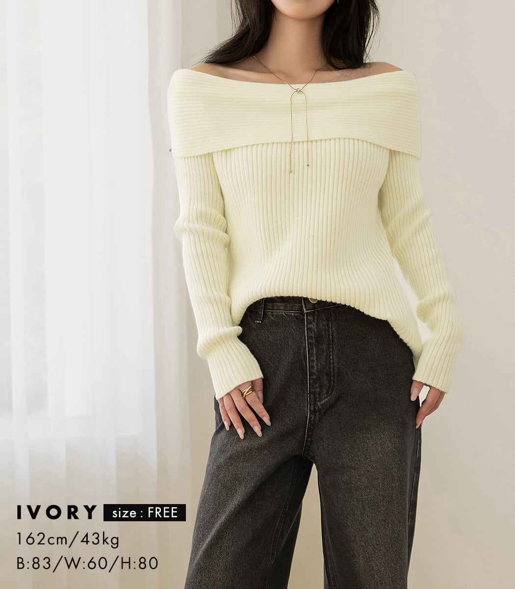 肩見せで大人の抜け感が出せるオフショルリブニット