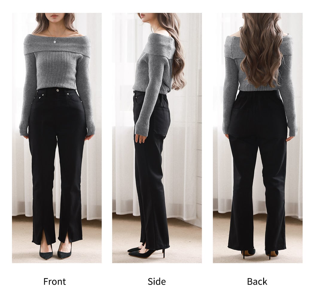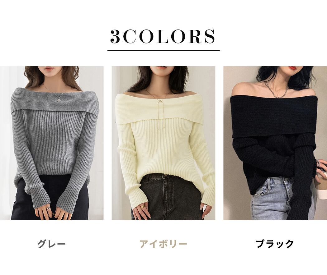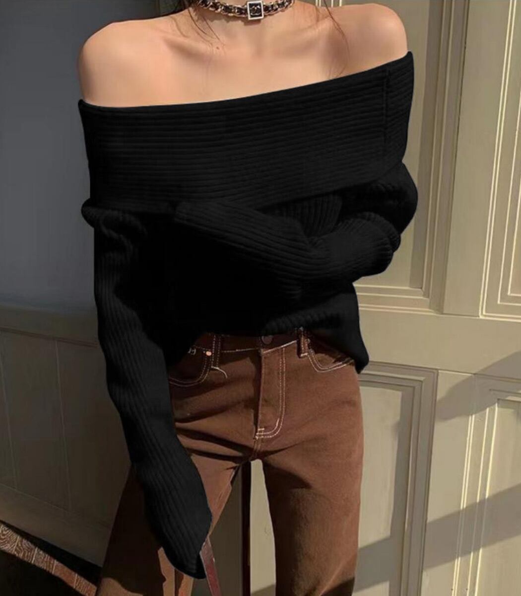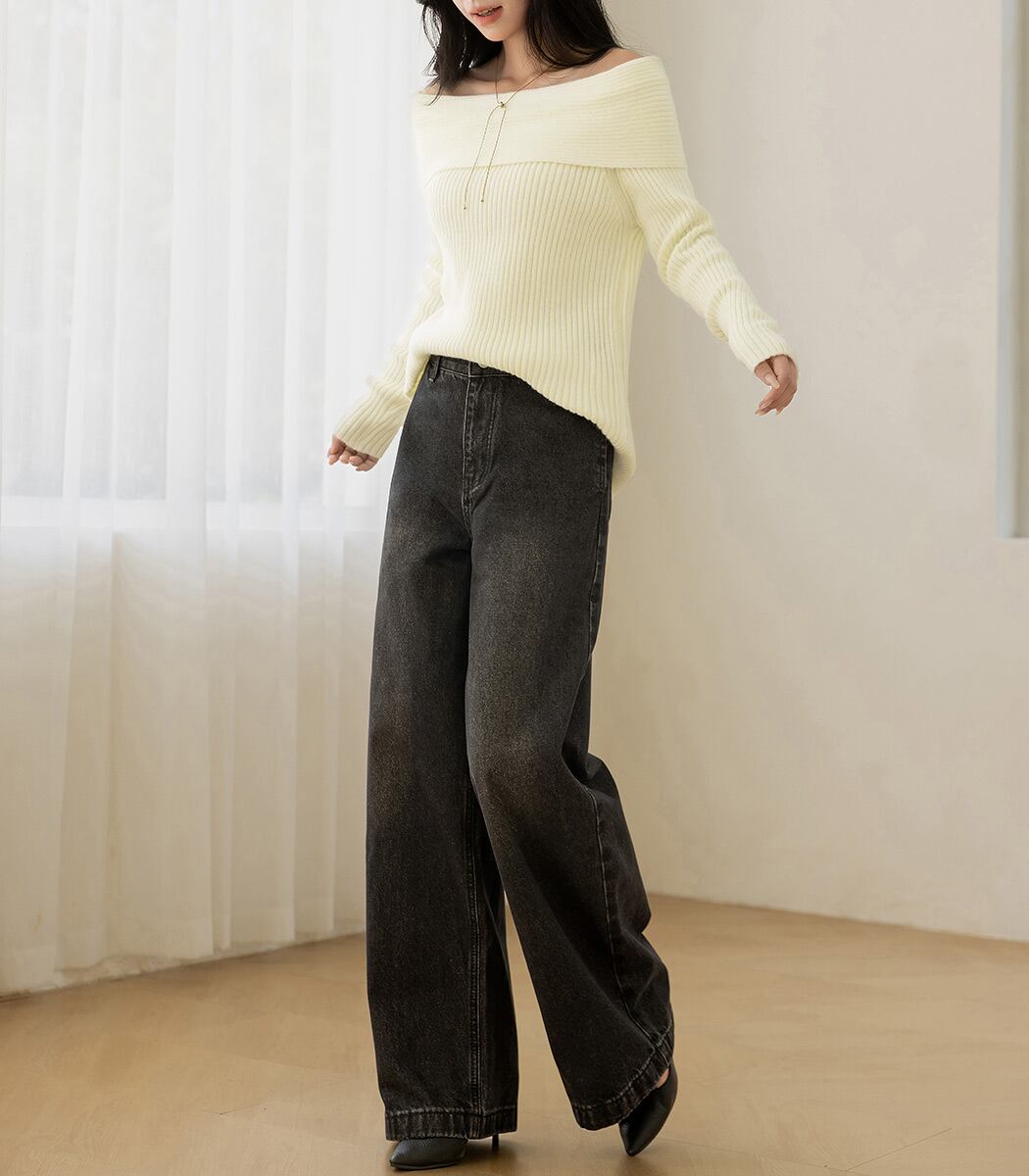 肩見せで大人の抜け感が出せるオフショルリブニット