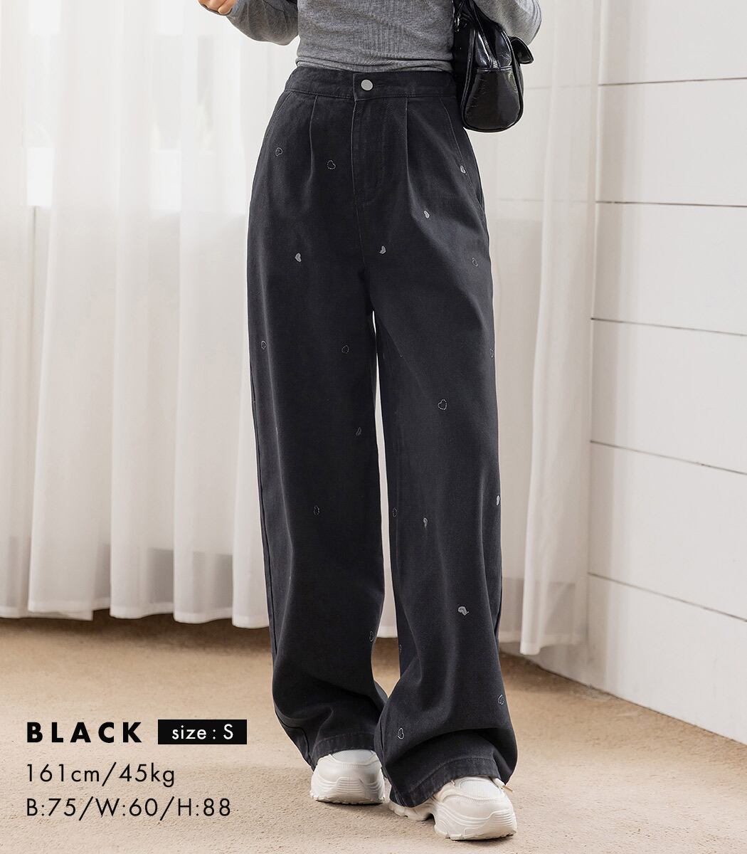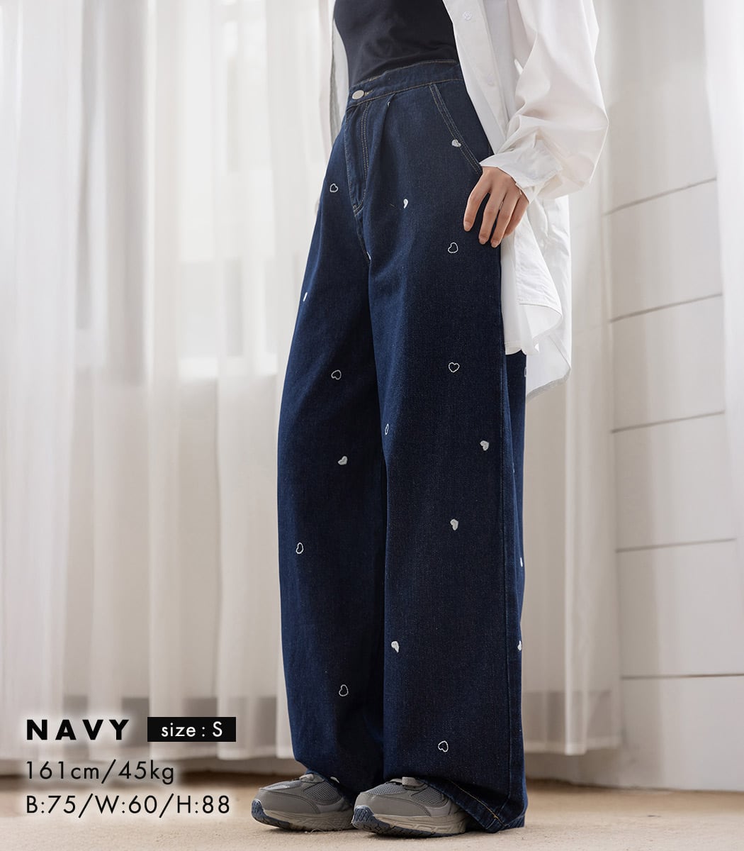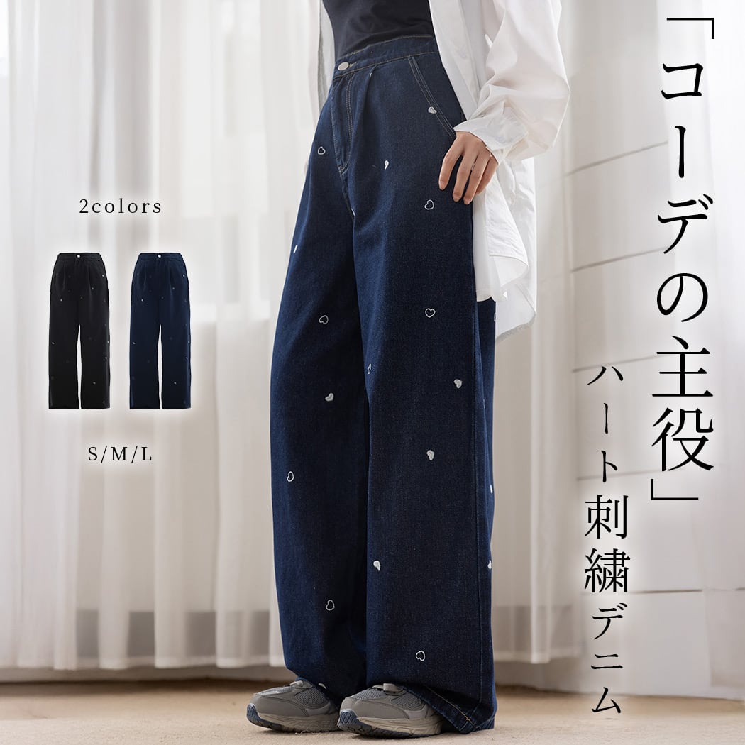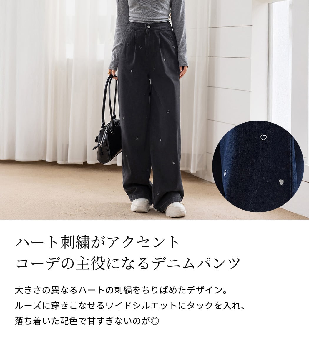 【宅配便】「ハート刺繍で主役級」デニム パンツ ワイド ストレート タック/pants664