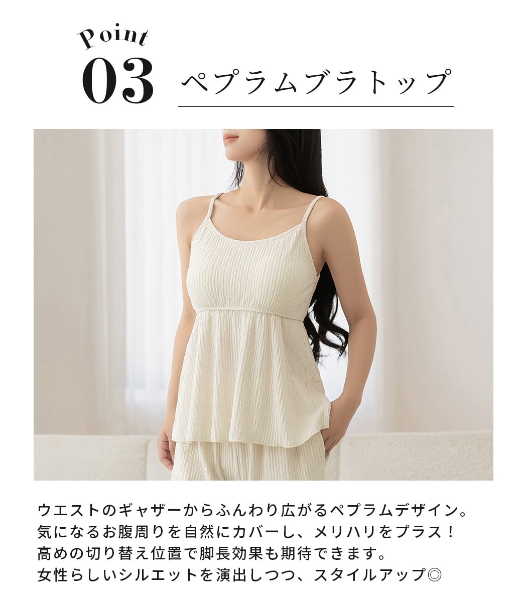 ウエストのギャザーからふんわり広がるペプラムデザイン。