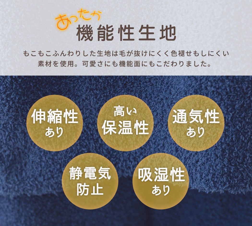 もこもこふんわりした生地は毛が抜けにくく色褪せもしにくい