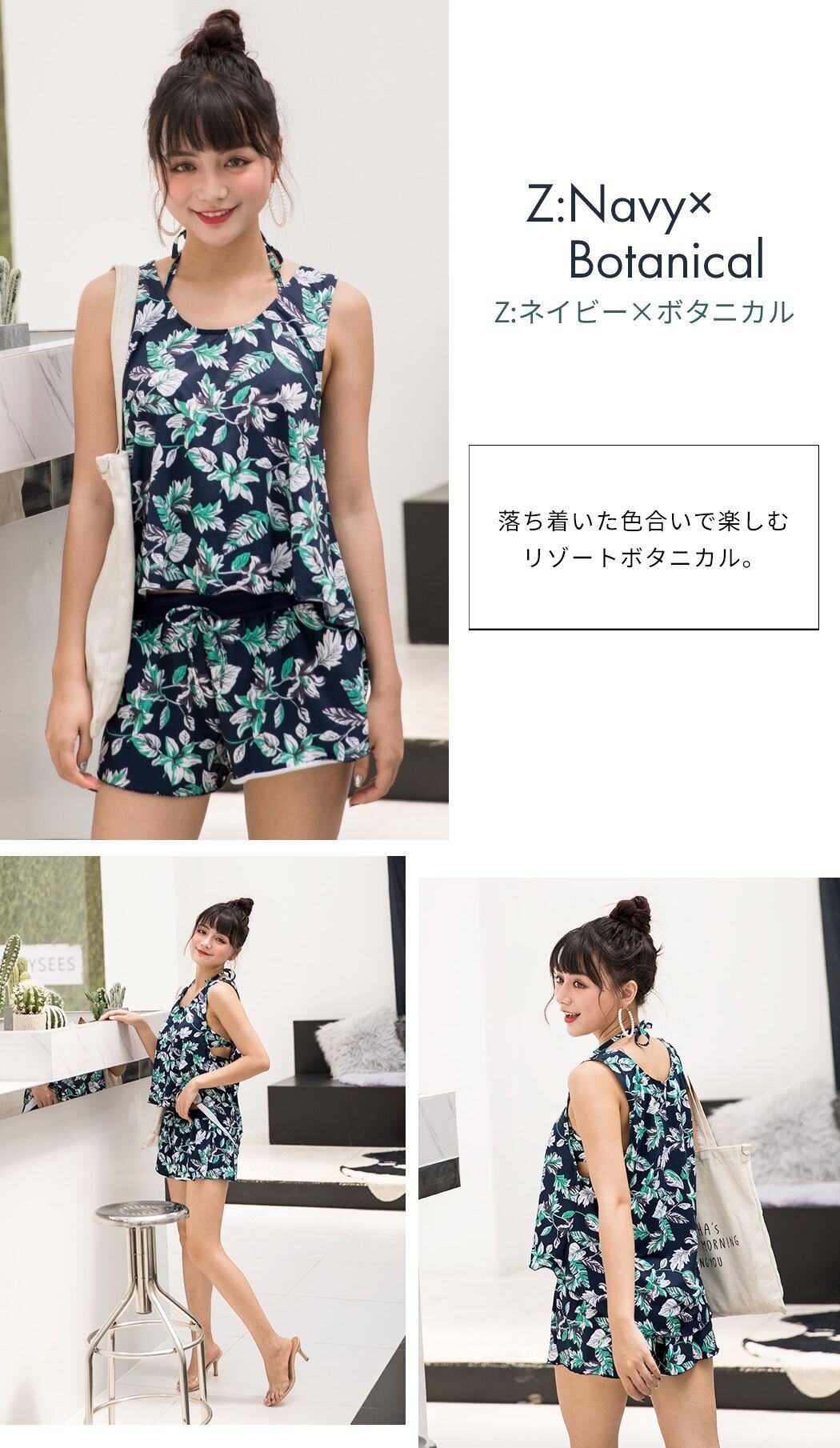 ネイビーとボタニカル柄の大人なリゾートスタイル。