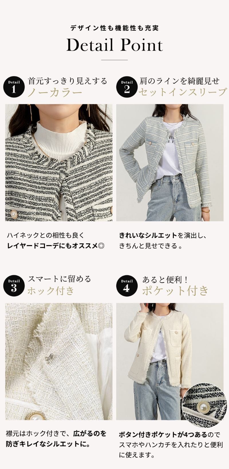 トレンド感溢れるクラシカルなツイード風ジャケット。