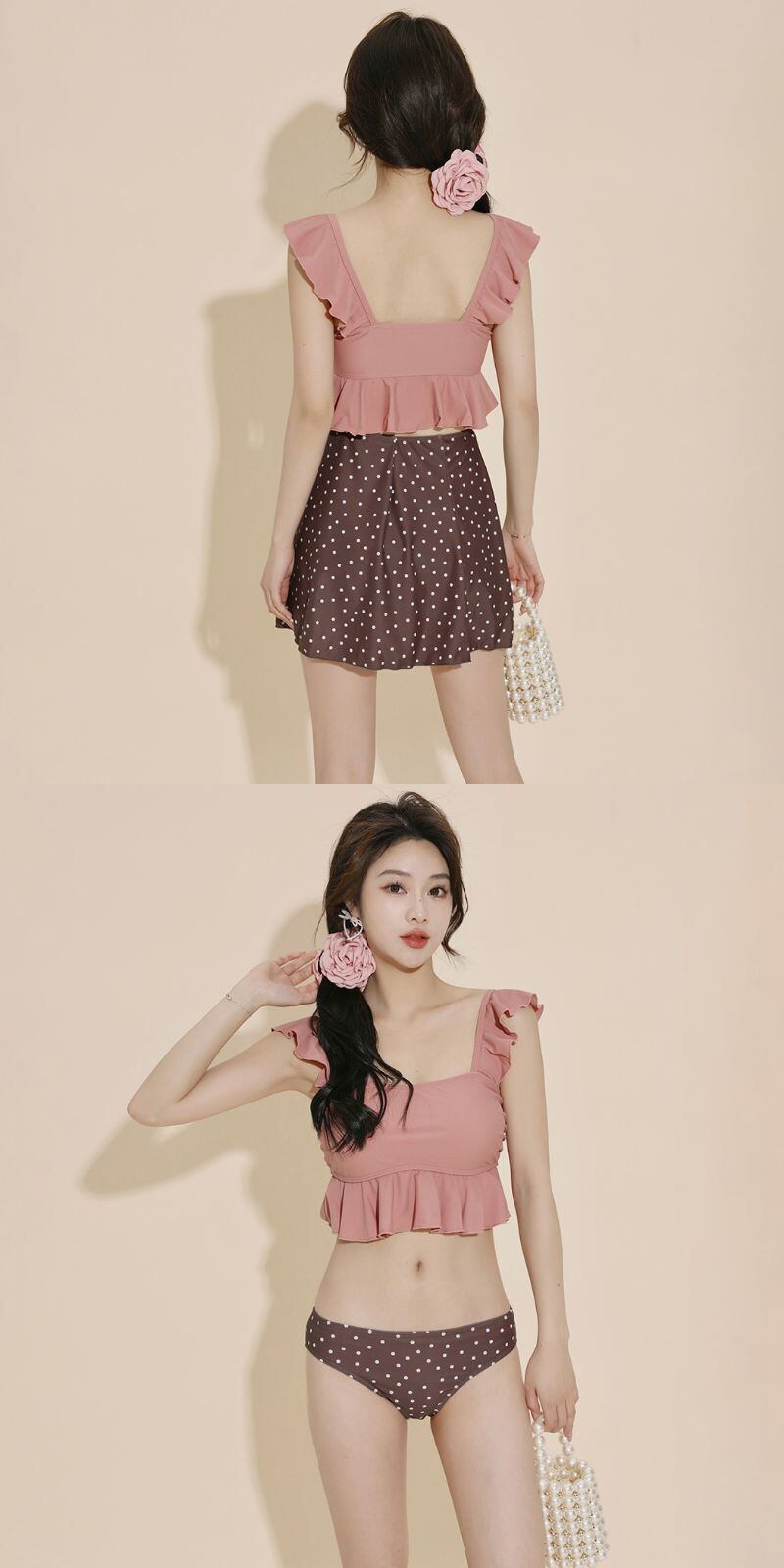 レトロチックな無地×ドット柄が可愛い3点セット水着。