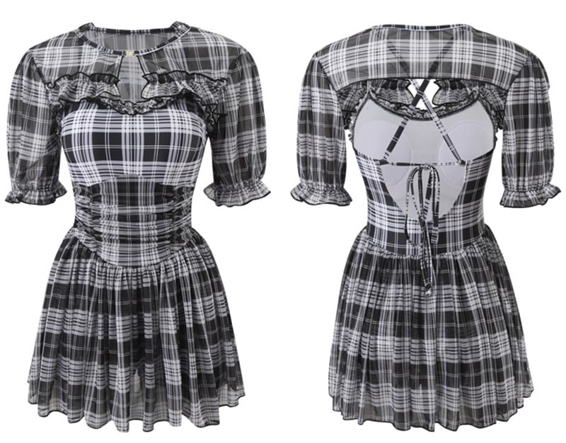 【宅配便】ボレロ付きシアーチェックワンピース/hys3166