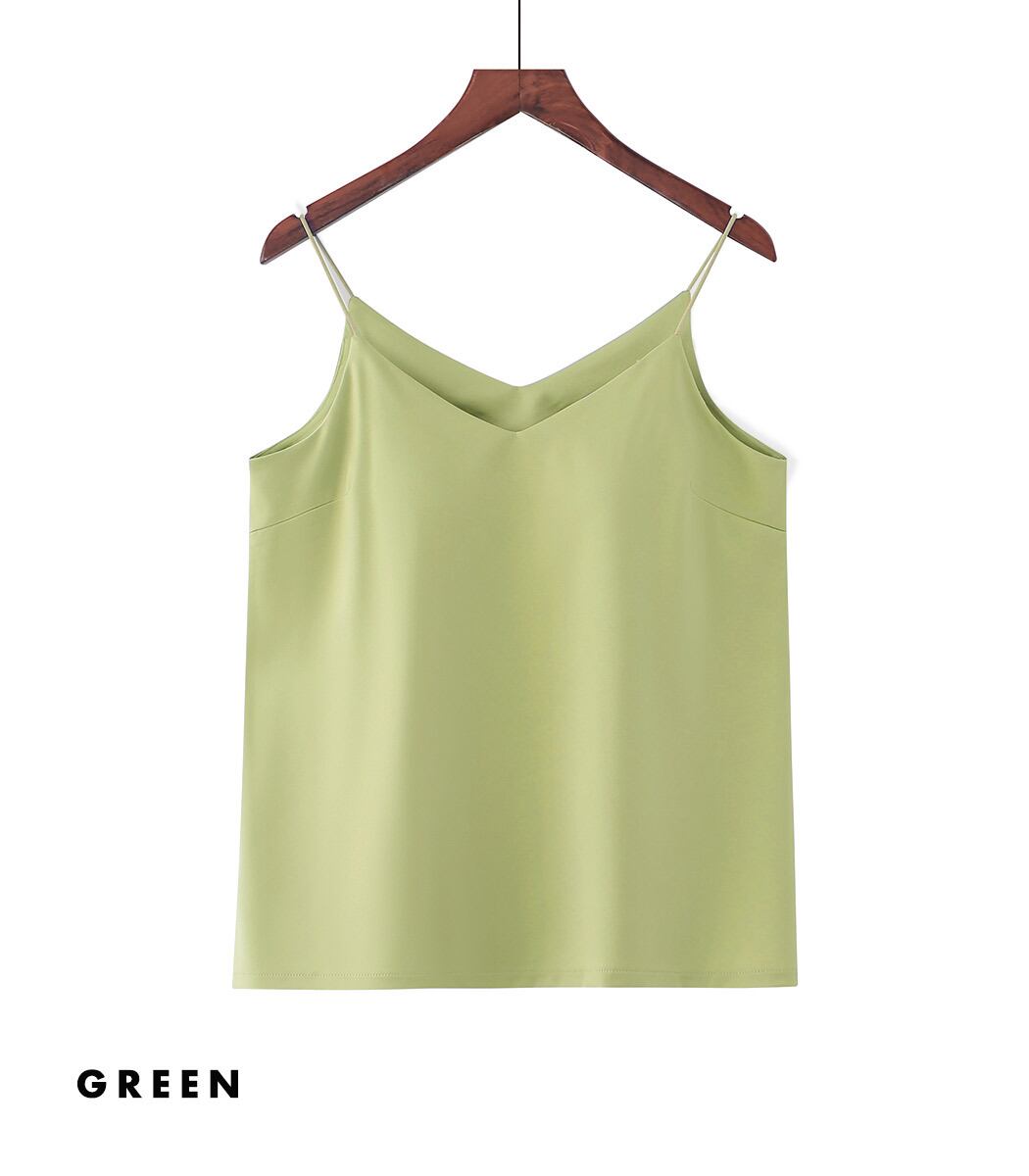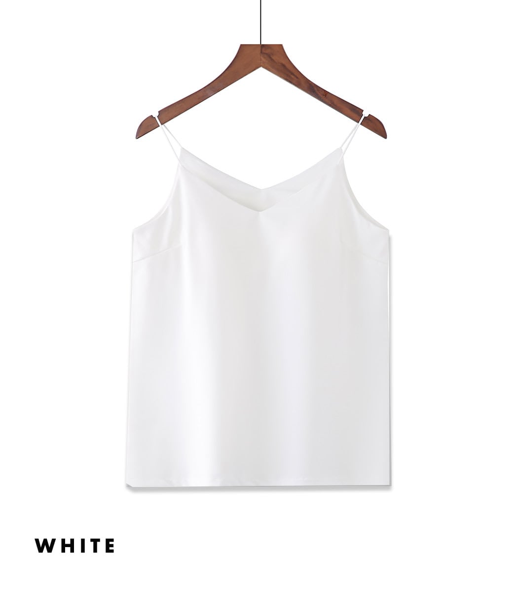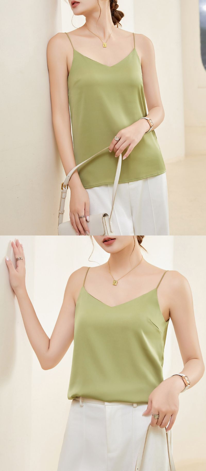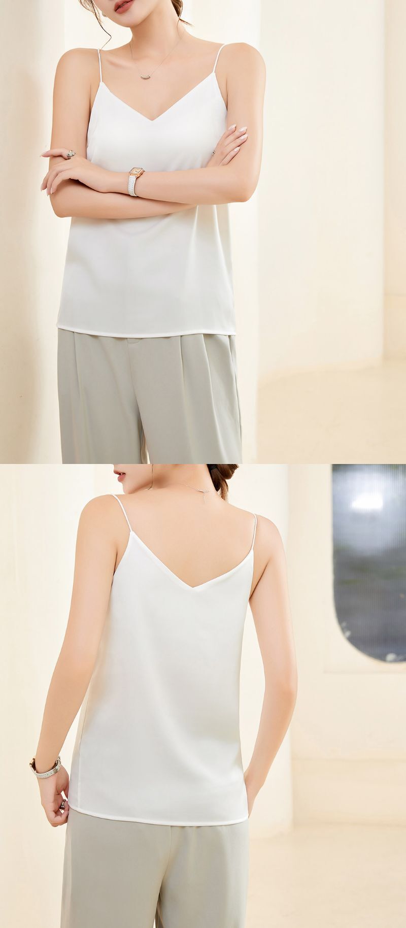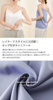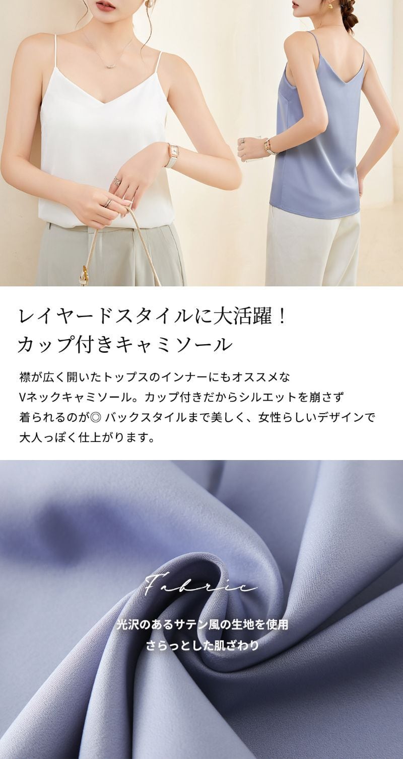 襟が広く開いたトップスのインナーにもオススメなVネックキャミソール。
