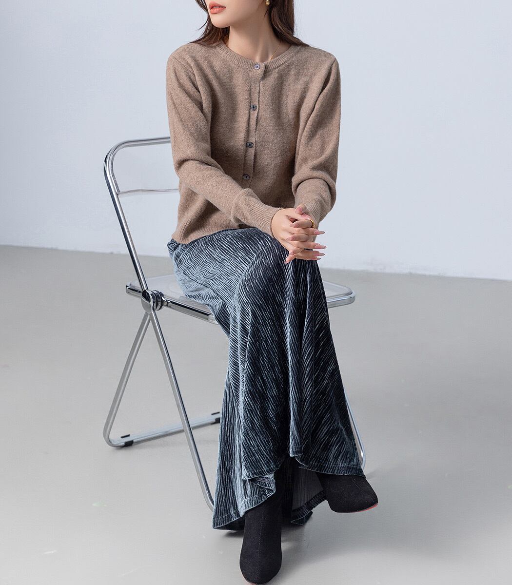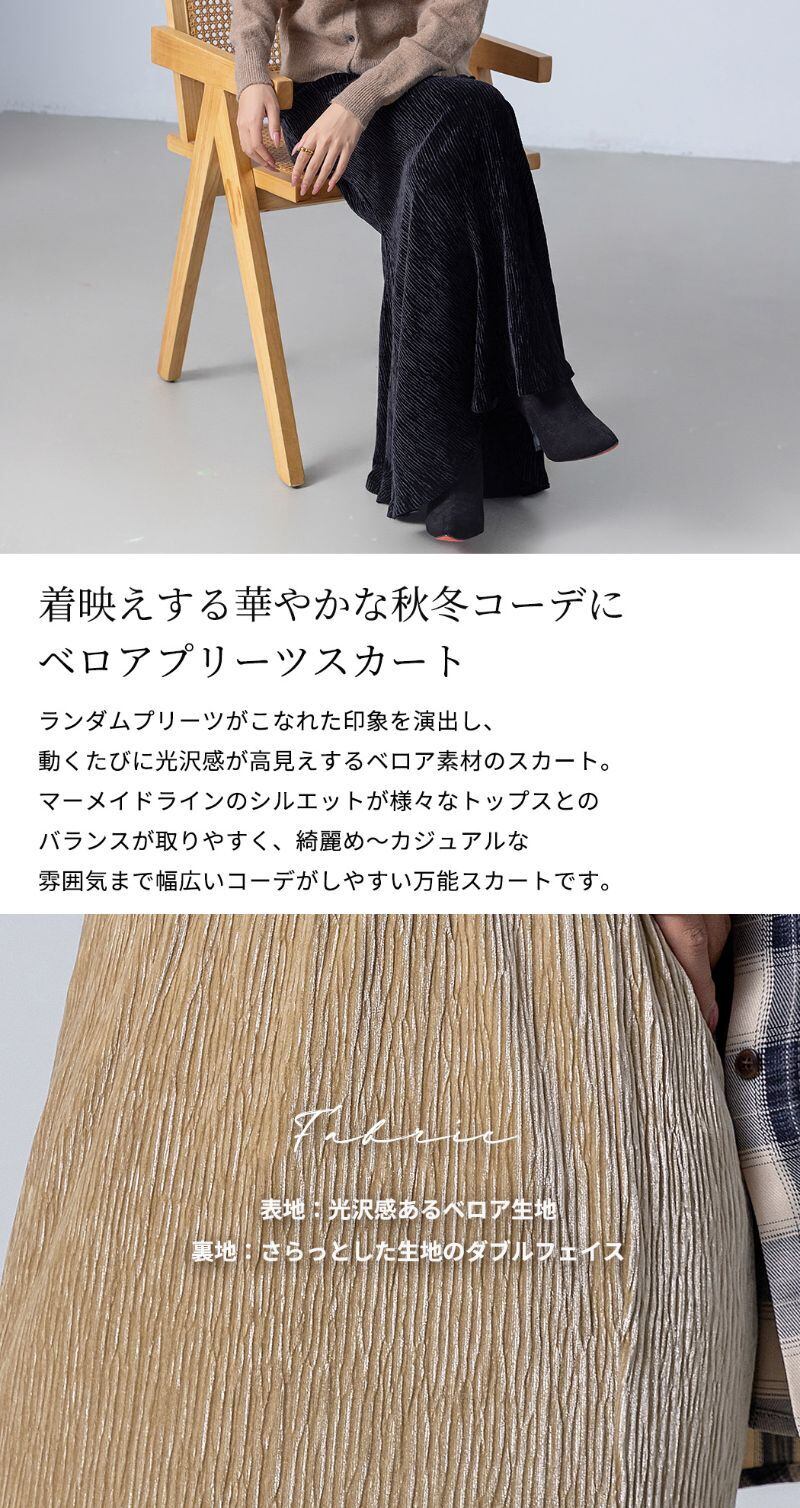 ランダムプリーツがこなれた印象を演出し、動くたびに光沢感が高見えするベロア素材のスカート。