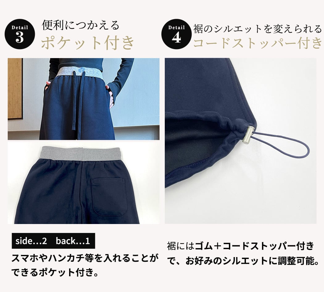 裾にはゴム+コードストッパー付きで、お好みのシルエットに調節が可能◎